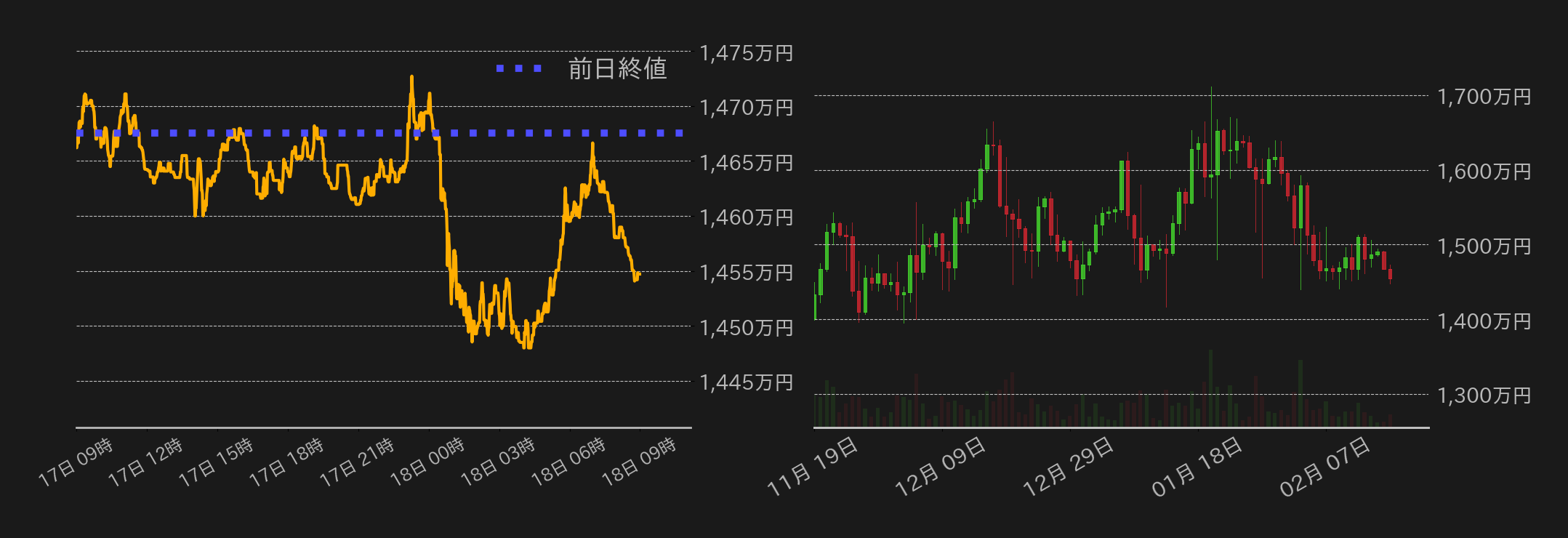 17日のビットコイン(BTC)円は1467万5777円から取引が始まった。取引材料に乏しい中、東京時間のBTC円はドル円相場の下落を受けて小甘く推移するも、1460万円で下げ止まった。海外勢参入後もはっきりと方向感を示せずにいたが、米国時間序盤にはやや水準を戻し、1470万円を回復した。一方、昨今のソラナ(SOL)上のミームコインの下落を受けて、SOL売りが加速すると、BTCも下げ足を速め1450万円周辺まで下落。その後は一時1465万円まで戻すも、今朝方には戻り売りが入り、終値は1454万7191円と続落した。