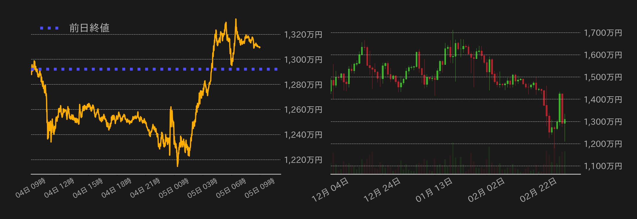 4日のビットコイン(BTC)円は1292万0199円から取引が始まった。前日にトランプ米政権がカナダ、メキシコ、中国に対する関税賦課を発表したことで、この日のアジア市場にもリスクオフムードが波及し、BTCは東京時間に1240万円近辺まで一段安を演じた。その後は底堅い推移に転じるも、ドル円相場の下落が相場の重石となり、欧州時間からはジリ安に推移。一時は1210万円まで水準を下げた。一方、米国時間に入ると、ラトニック米商務長官が「トランプ大統領はカナダとメキシコに対する関税軽減を明日発表する可能性がある」と明らかにしたことで相場は持ち直し、1300万円を回復。終値は1309万5990円となった。