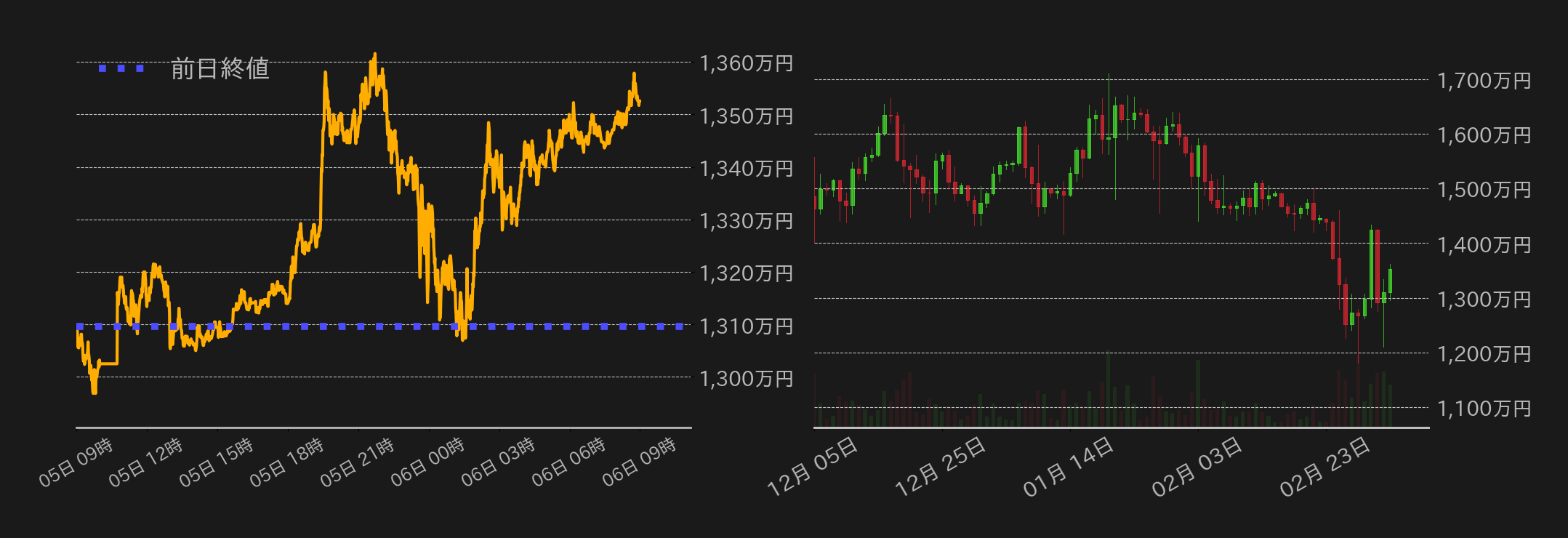 5日のビットコイン(BTC)円は1309万5989円から取引が始まった。東京時間は動意に欠ける展開となったが、トランプ関税による貿易摩擦の軽減期待やドル指数の下落を眺め、海外時間に上値を伸ばし、今月3日から4日の急落の半値戻し1321万円を回復した。米国時間序盤に発表された1月のADP雇用レポートでは雇用者数が+7.7万人と市場予想の+14万人を大きく下回り、一時リスクオフムードが広がったが、ISM非製造業PMIが改善すると、半値戻し周辺から反発。その後、トランプ米大統領がカナダとメキシコに対する関税を巡って、北米車メーカーへの適用を1カ月延期すると発表したことで、リスクオフムードが更に巻き戻し、1352万5490円でこの日の取引を終えた。