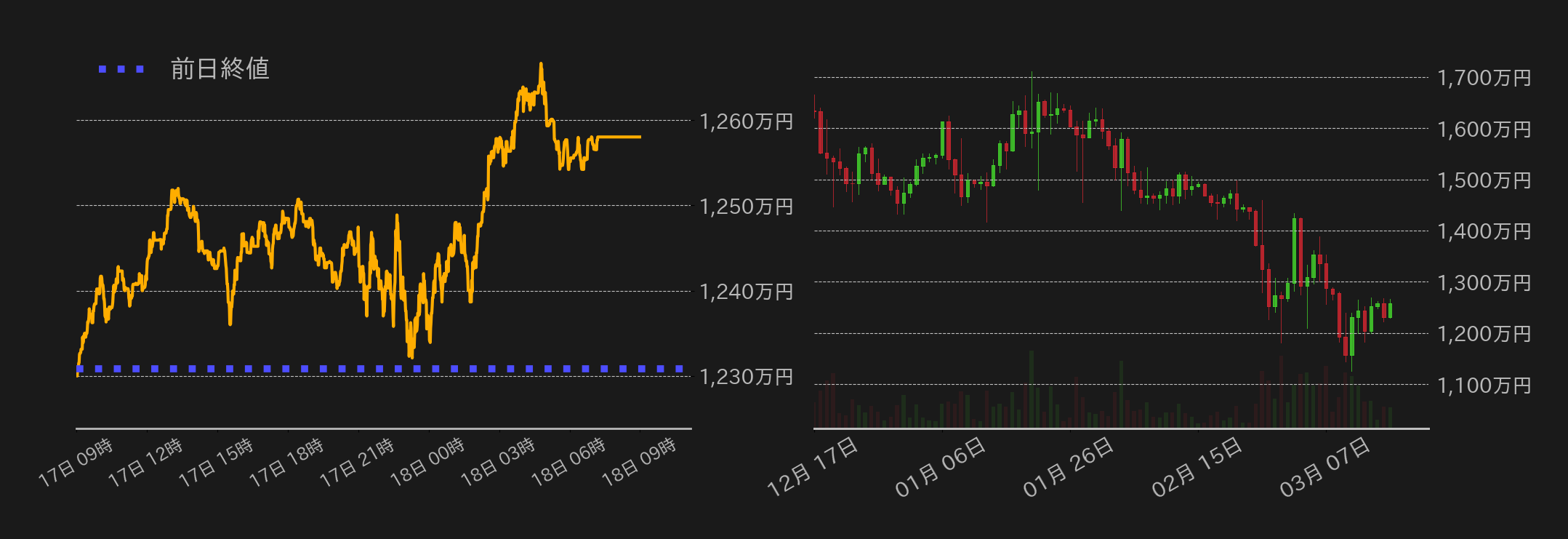 17日のビットコイン(BTC)円は1230万8000円から取引が始まった。シカゴマーカンタイル取引所(CME)のBTC先物が週明けに上窓を開けたことや、トランプ米大統領がプーチン露大統領との直接対談を仄めかす発言をしたことで、東京時間は地合いが小締まるも、窓埋め達成後には1250万円周辺で上値を抑えられ失速した。米国時間序盤にはまちまちな指標を受けて小幅に振れる展開となったが、米国株相場が割安感から上昇すると、終盤にかけて1250万円を上抜け、週末の下げ幅を奪回した。ただ、現地時間19日の米連邦公開市場委員会(FOMC)を控えた警戒感から上値は限定され、米国市場引け後にはやや水準を落とし、終値は1258万0386円となった。