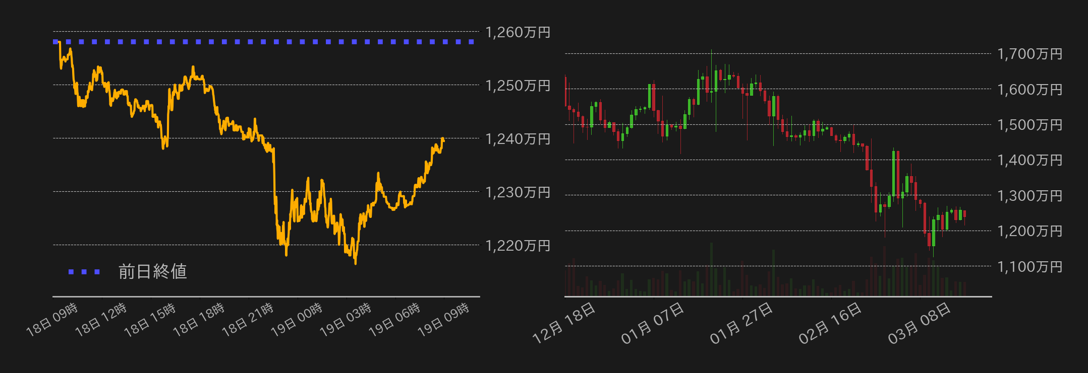 18日のビットコイン(BTC)円は1258万0386円から取引が始まった。週明けの反発でドル建てBTC相場が200日線回復に失敗したことで、この日の東京時間は戻り売り優勢となり1240万円周辺まで下落した。海外勢参入後には一時1250万円まで戻すも、上値の重い展開が続き、米国時間序盤には米株の下落に連れ安となり1220万円周辺まで一段安を演じた。しかし、残りの米国時間は同水準で下げ渋ると、終盤にかけて1230万円を回復した。その後、トランプ米大統領とプーチン露大統領の電話会談で、ロシアがウクライナのエネルギー施設への攻撃を30日間停止することで合意したことを受け、1240万円近辺まで上昇し、終値は1239万4546円となった。