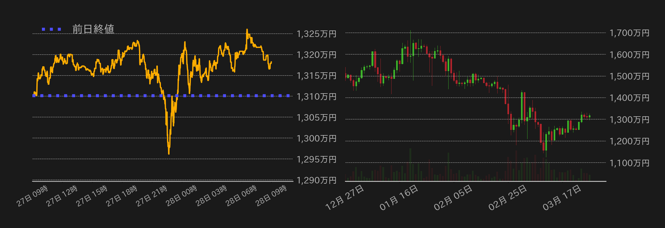 27日のビットコイン(BTC)円は1310万1167円から取引が始まった。東京時間はジリ高に推移し1320万円まで戻すと、海外勢参入後に一時同水準を回復した。しかし、米経済指標の発表を控えその後は上げ幅を縮小すると、カナダやEUによるトランプ政権の相互関税への報復措置検討が嫌気され、米国時間序盤に1296万円まで急落を演じた。一方、四半期次の米GDPデフレーターやコアPCEといったインフレ指標が下方修正されたこともあって、売り一巡後には反発し下げ幅を奪回した。尤も、米国株相場の続落に加え、次期米SEC委員長候補の就任公聴会で投票が延期されたことで、その後は上げ渋る展開となり、終値はほぼ変わらずの1318万1765円となった。
