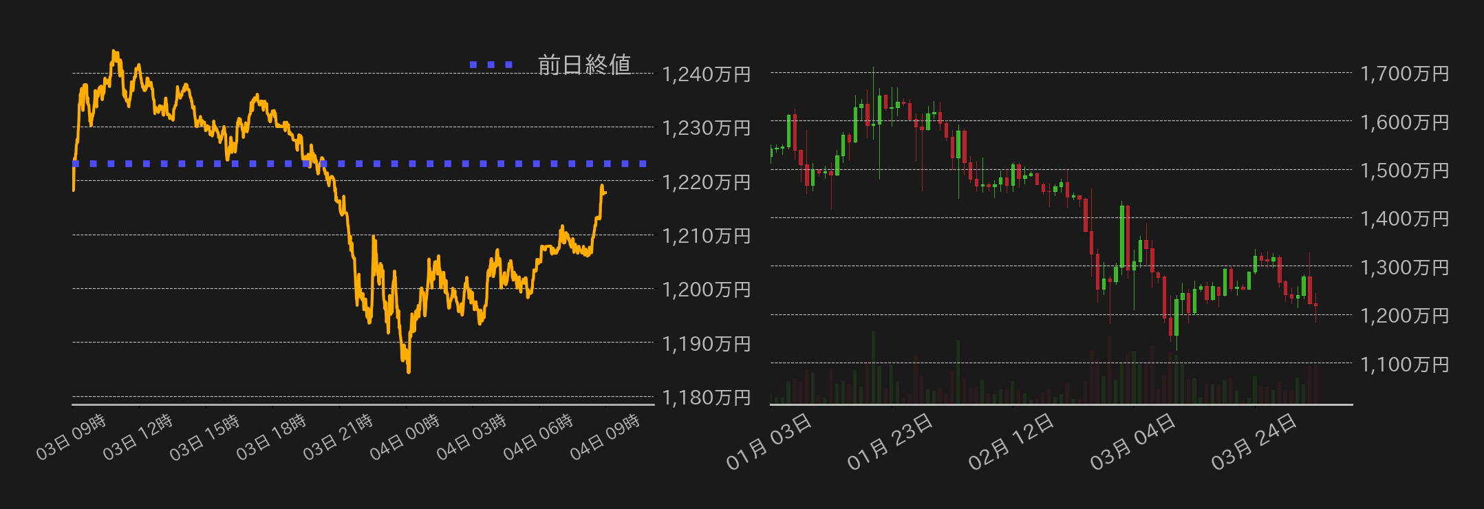3日のビットコイン(BTC)円は1223万266円から取引が始まった。トランプ米政権の相互関税発表による急落から、東京時間は反動高で1244万円周辺まで戻すも、リスクオフムードが世界の金融市場に波及する中、中盤からは失速。欧州時間に入ると売りが加速した他、ドル円相場の下落が円建てBTC相場の重石となり、下げ足を速めた。更に、米国時間序盤には米国株相場の下落に連れてBTCは1184万円近辺まで水準を落とした。一方、米上院銀行委員会がポール・アトキンス氏の次期米SEC委員長就任を13-11で決定し、任命プロセスが上院での最終投票に進むと、BTCは下げ止まり、引け後からは徐々に下げ幅を縮小。終値は1200万円を回復し、1217万7356円となった。