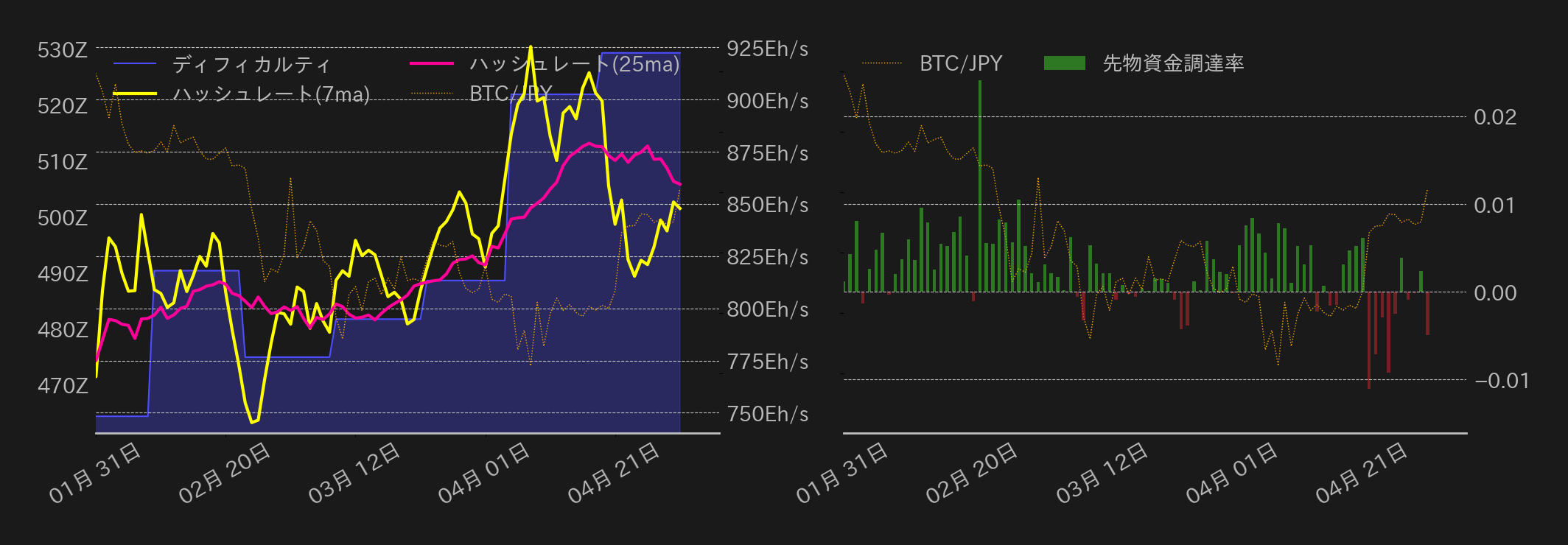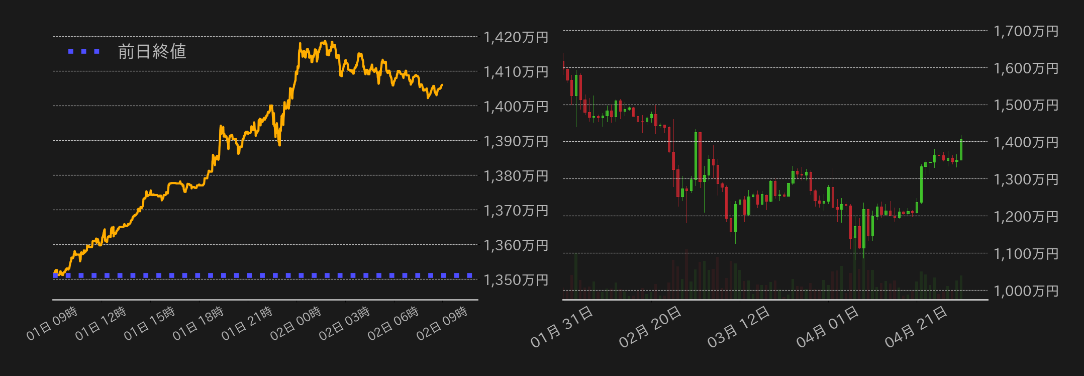 5月1日のビットコイン(BTC)円は1350万7630円から取引が始まった。前日の米インフレ指標の伸び減速を受けて、米連邦準備理事会(FRB)による年内の利下げ再開期待が台頭する中、東京時間はジリ高に推移し、前日の高値1365万円を上抜けた。欧州時間も買い優勢となり、相場は1400万円を試すと、米国時間序盤には1420万円近辺まで上値を伸ばした。この日はマイクロソフトやメタの好決算が米国株相場の追い風となった他、中国が関税を巡って米国と交渉する可能性を仄めかしたことで、リスク先行度が上向いた。一方、米国市場中盤からは上げ渋る展開となり、終値は1405万9338円となった。