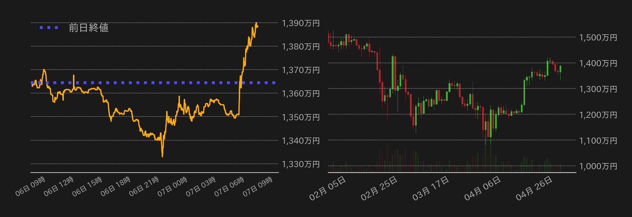 6日のビットコイン(BTC)円は1364万3672円から取引が始まった。週末にアリゾナ州知事が戦略的ビットコイン備蓄(SBR)法案に拒否権を行使した他、FOMCを控えた売りによってBTCは週明けから上値の重い展開を繰り広げ、昨日の米国時間序盤には1330万円近辺まで水準を下げた。一方、安寄りした米国株相場が上昇するとBTCも下げ止まり、米ニューハンプシャー州(NH)知事が米国の州で初めてSBR法に署名したことで、1350万円を回復。さらに今朝方には、トランプ関税を巡る米中高官による初の協議が今週土曜日にスイスで行われると報じられ、BTCは1390万円まで急伸した。終値は1388万2251円となり、週末の下げの殆どを奪回した。
