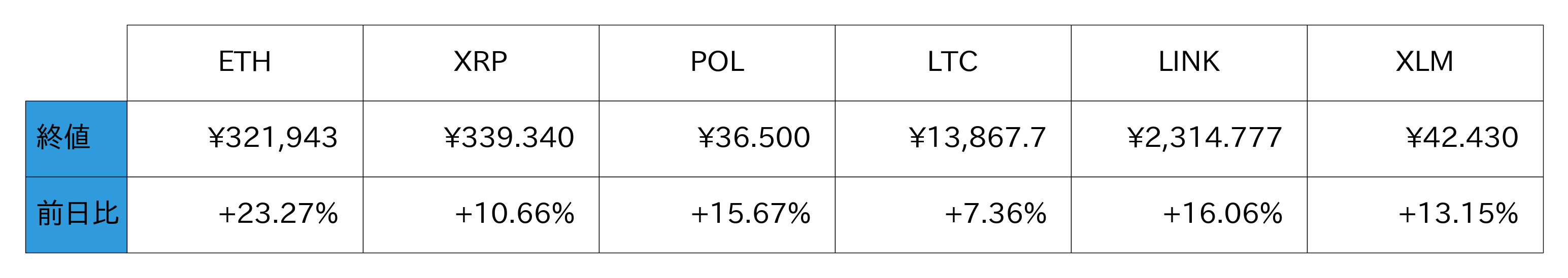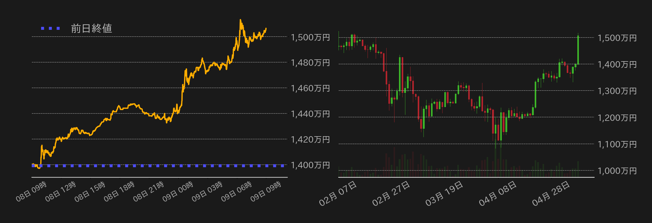 8日のビットコイン(BTC)円は1398万9878円から取引が始まった。米アリゾナ州が戦略的暗号資産(仮想通貨)備蓄法を可決させたことで、東京時間から上値を追う展開を繰り広げ、保ち合い上放れに成功。欧州時間にも買いは続き、1440万円を回復した。米国時間序盤には、米英が貿易協定で合意したと両国首脳が発表。米国は相互関税の上乗せ分を撤廃し、英国は対米関税の引き下げで合意した。これを受けて米国時間はリスク資産に資金が流れ、BTCは1400万円台後半に突入。終盤には一時1517万円近辺まで上昇し、ドル建てでは10万4000ドルにワンタッチした。終値は1506万3460円と、2月中旬ぶりの水準まで戻した。