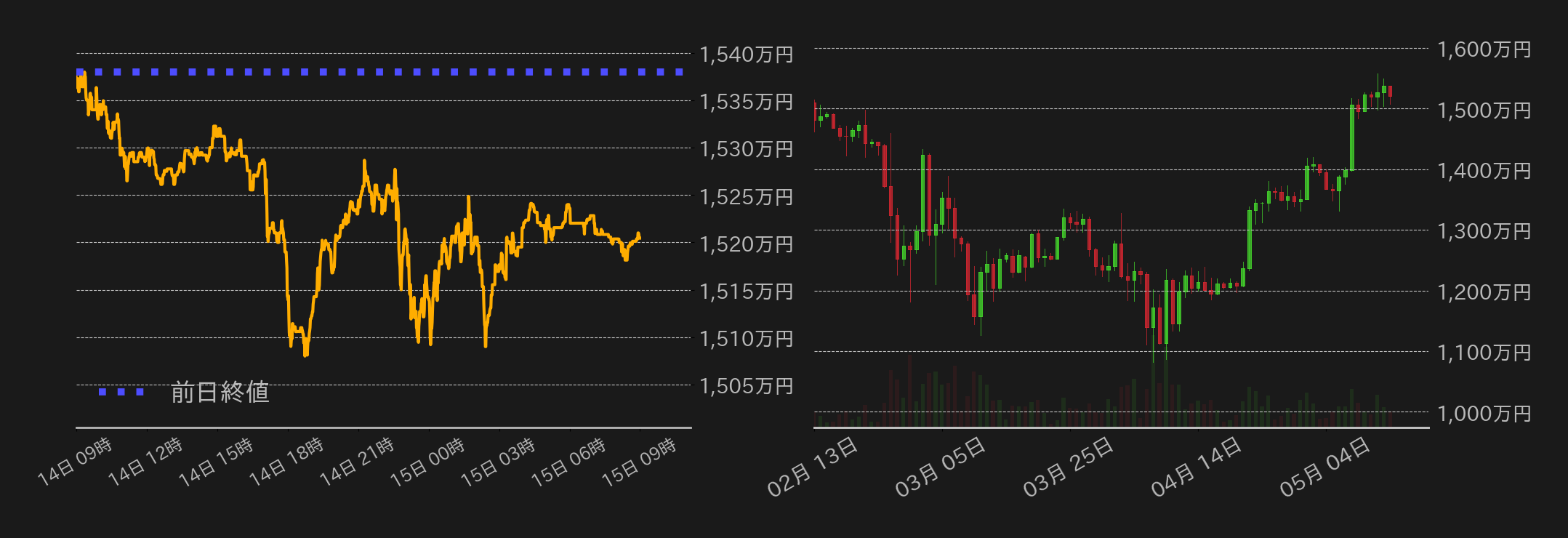 14日のビットコイン(BTC)円は1537万9300円から取引が始まった。アリゾナ州知事が暗号資産(仮想通貨)準備金に関する2つの法案に拒否権を行使したことで、東京時間はジリ安に推移すると、終盤には米韓が為替政策を協議していたとの報道を受けた円高の影響で1500万円近辺まで下落した。尤も、これによりドルが主要通貨に対して下落したことで、BTCはその後切り返した。一方、米国時間には本日の米経済指標やパウエルFRB議長発言を控え、相場は揉み合いに終始。結局は1510万円で下げ渋る展開となり、終値は1520万4501円と前日の上げ幅を解消した。