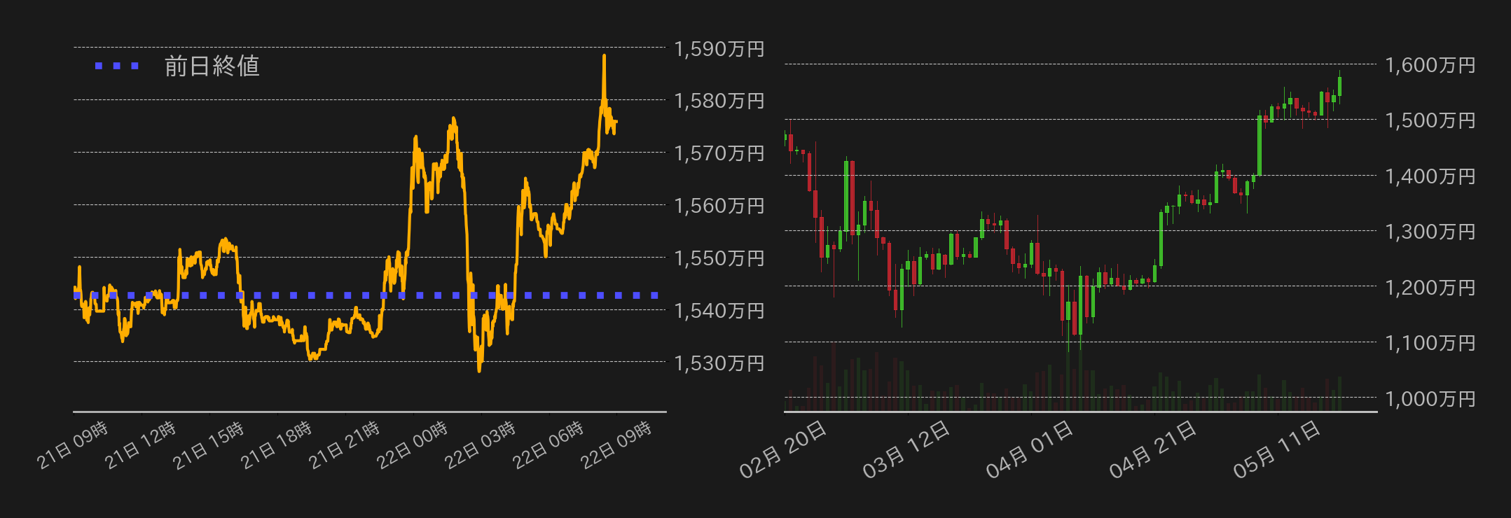 21日のビットコイン(BTC)円は1542万8821円から取引が始まった。東京時間は小幅に揉み合いつつも、終盤には1550万円で推移し、ドル建てでは10万8000ドルにタッチしたが、欧州時間に入ると一時的に1530万円まで反落した。一方、米テキサス州での暗号資産(仮想通貨)準備金法案(SB21)成立への期待や、米国の財政問題が意識される中、米国時間序盤に買い戻され、1570万円台に浮上。その後、米株の急落を受けて一時は上げ幅を吐き出すも、テキサス州でSB21の3度目の投票が行われ、賛成多数で可決されると、相場は再び上昇し1590万円に肉薄。終値は1575万8010円となり、ドル建てでは1月につけた史上最高値を更新した。