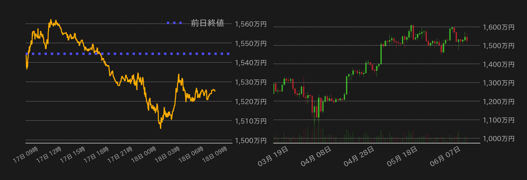 17日のビットコイン(BTC)円は1544万5287円から取引が始まった。トランプ大統領がイランと会合するとの情報で1560万円を回復したBTCだったが、トランプ氏がこれを否定したことで欧州時間にはマイナス圏に沈むと、米国時間序盤には1510万円まで一段安を演じた。一方、中盤から終盤にかけて米国株相場が下落する中、ドル建てBTC相場が一目均衡表の雲に支えられる格好で俄かに反発し、円建てでは一時1530万円を回復。終値にかけては1520万円台で揉み合いとなり、1525万1330円でこの日の取引を終えた。