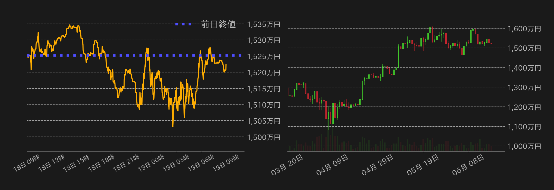 18日のビットコイン(BTC)円は1525万1329円から取引が始まった。東京時間は前日の下げから揺り戻しとなり1535万円近辺まで戻したが、終盤からは米連邦公開市場委員会(FOMC)を控え戻り売りが入り、欧州時間には1510万円周辺まで水準を下げた。一方、その後は米国株相場の上昇を受けてBTCは下げ止まった。FOMCでは金利の据え置きが決定され、経済見通し(SEP)ではスタグフレーションを想起させる見通しが示された。一方、金利見通しは年内2回の利下げが維持された。結果を受けてBTCは一時下値を試すも、パウエル議長が利上げシナリオを否定したこともあってその後は反発し、終値は1522万3973円とほぼ変わらずだった。