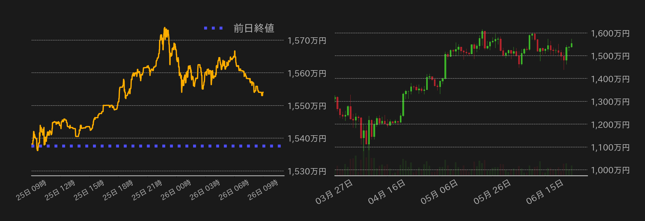 25日のビットコイン(BTC)円は1537万9000円から取引が始まった。イスラエルとイランの停戦が保たれる中、テクニカル的なセンチメントの改善も相場の追い風となり、東京時間のBTCは強含みに推移し、終盤には1550万円を回復。欧州時間にも買いが続く中、ドル円相場の上昇も支援となり、米国時間序盤には1573万円まで戻した。一方、これによりドル建てBTC相場が10万8000ドルにタッチすると、トランプ大統領による中東紛争の再開を危惧する発言を受け、上げ幅を縮小した。その後は、FRBの利下げ期待から底堅く推移するも、米国市場引け後からは売り優勢となり、終値は1554万1円となった。