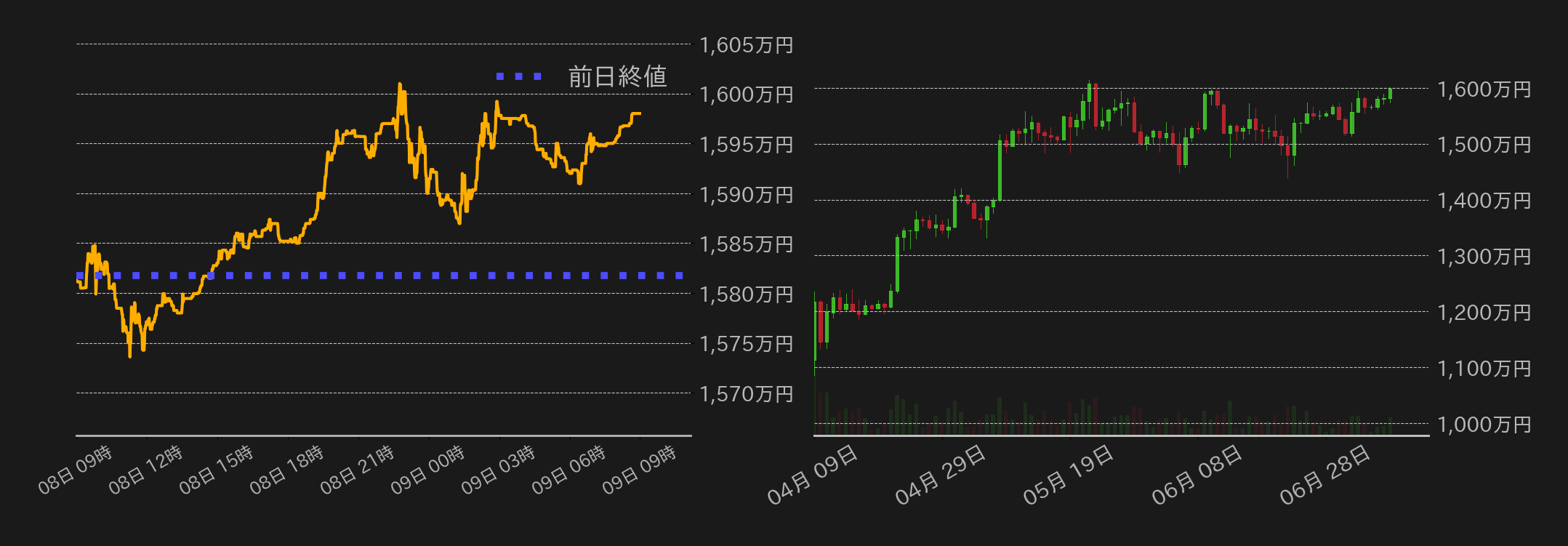 8日のビットコイン(BTC)円は1581万7629円から取引が始まった。東京時間序盤は1575万円まで下落するも、売り一巡後には反発し下げ幅を奪回した。終盤から欧州時間にかけては、日本やドイツの国債利回り上昇が米長期金利を押し上げる中、1600万円を窺う展開となったが、その後は米国株相場の軟化が相場の重石となり、1590万円まで水準を下げた。一方、6月の米消費者の1年先インフレ期待が2カ月連続で低下したことで再び1600万円に肉薄。米国市場終盤には上げ渋る展開となるも、引け後も底堅い推移を維持し、終値は1598万5円と5月ぶりの水準に戻した。