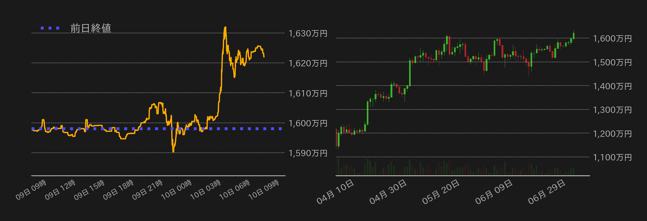 9日のビットコイン(BTC)円は1598万5円から取引が始まった。東京時間は材料待ちとなり、前日終値を挟み込み小幅な揉み合いに終始すると、欧州時間にはやや買い優勢となり1600万円を回復した。一方、米国時間序盤には、高寄りしたナスダックが上げ渋る展開となり、BTCは一時1590万円まで反落。尤も、エヌビディアを筆頭にハイテク株が粘り腰を発揮する中、BTCも下げ止まると、6月の米連邦公開市場委員会(FOMC)議事要旨で、当局者のトランプ関税による物価上昇への影響の見解が割れていたことが好感され、米金利の低下を味方にBTCは1630万円にタッチ、ドル建てでは僅かに史上最高値を更新した。その後はやや水準を下げ、終値は1622万円となった。