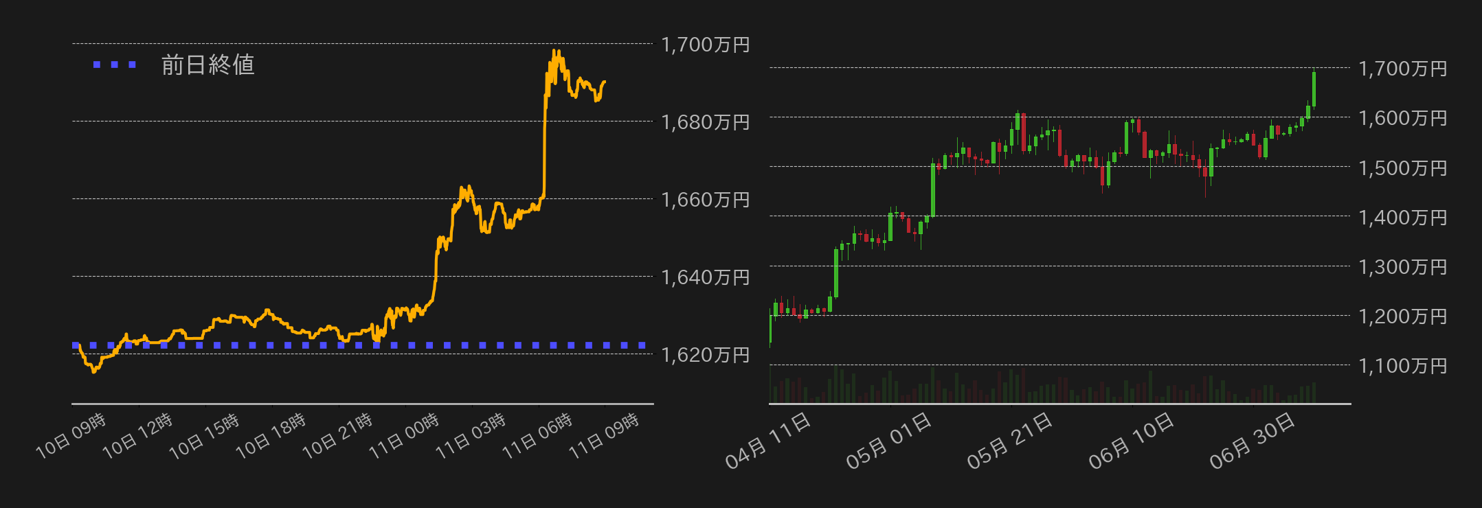 10日のビットコイン(BTC)円は1622万円から取引が始まった。東京時間は動意薄な展開となるも、ドル円相場の上昇に伴ってジリ高に推移し、終盤には1630万円にタッチした。欧州時間に入ると相場は失速するも、米国時間には米国株相場の上昇に連れて1630万円台に乗せると、米国税庁(IRS)が暗号資産(仮想通貨)の分散型取引所(DeFi)などに対して義務付けていた顧客取引情報の提出規則の撤廃を発表し、規制緩和期待によって相場は1660万円まで上昇。今朝方にはショートカバーを伴って更に一段高を演じ、1700万円に肉薄した。終値は1689万9999円となり、1月ぶりの水準を回復。ドル建てでは史上最高値を更新した。