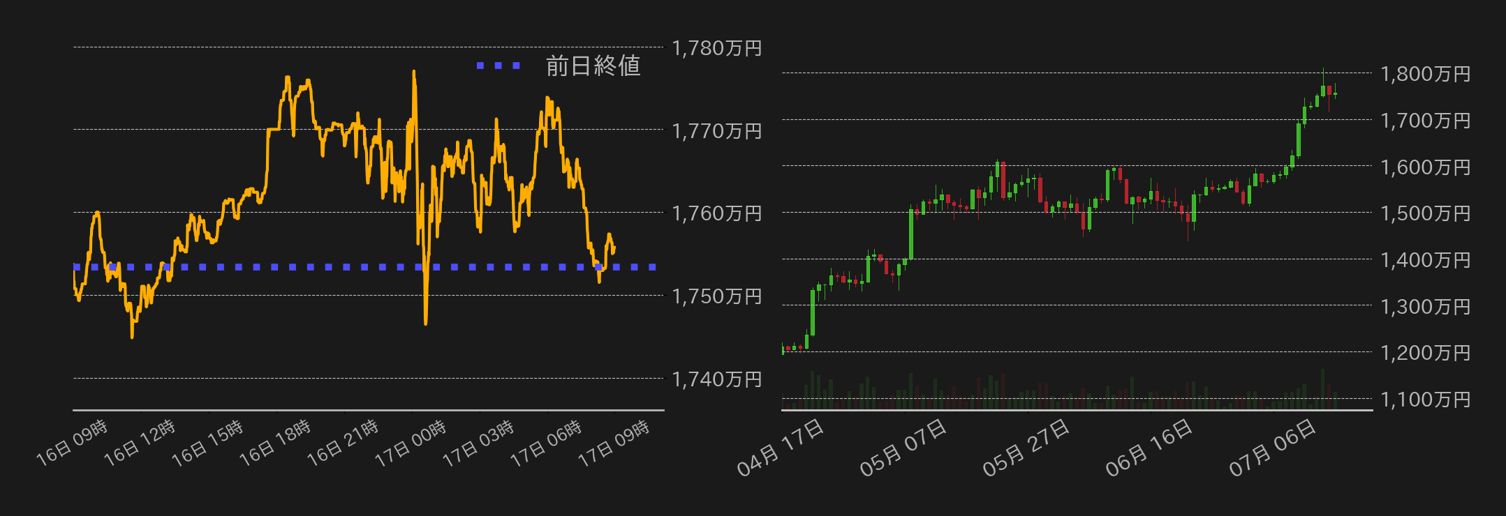 16日のビットコイン(BTC)円は1753万3691円から取引が始まった。米国での暗号資産(仮想通貨)関連法案成立への期待感や、米消費者物価指数(CPI)の結果を消化する形で、東京時間から欧州時間のBTC円は強含みに推移し1770万円を回復した。注目だった6月の米卸売物価指数(PPI)は市場予想比で下振れた一方、ホワイトハウス高官が、トランプ氏が近くパウエルFRB議長を解任する意向だと報道されると、ドル円相場の急落を受けて円建てBTC相場の上値は圧迫された。ただ、トランプ氏がすかさず報道を否定したことで相場は底堅く推移。尤も、終盤に相場が12万ドル水準(1779万円)にタッチすると戻り売りが入り、終値は1755万7357円とほぼ変わらずだった。