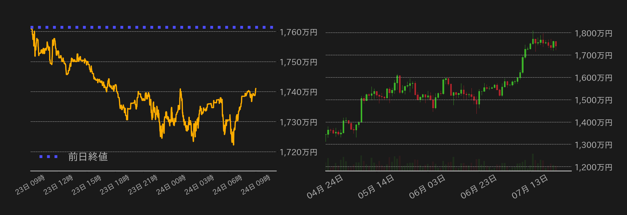 23日のビットコイン(BTC)円は1761万3432円から取引が始まった。前日にドル建てで節目の12万ドルを回復したBTCだったが、この日は戻り売りが入り東京時間は1740万円まで下げ一色となった。欧州勢参入後には1720万円台まで更に下落したが、米国の対EU関税が当初の30%ではなく日本と同様に15%に引き下げられる可能性があるとの報道を受け、米国時間のBTC円は米国株相場の上昇に支えられ下げ止まった。米国市場引け後はドル円相場の下落に上値を抑えられつつも水準を戻し、終値は1741万円となった。