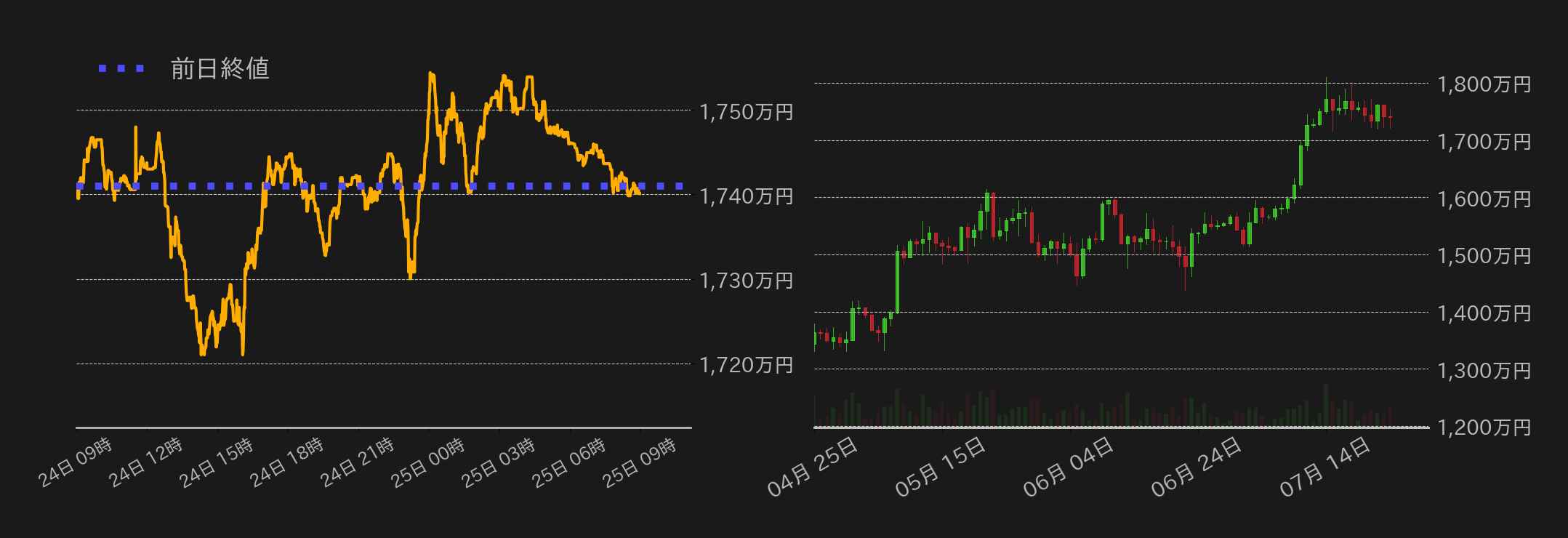 24日のビットコイン(BTC)円は17410万560円から取引が始まった。東京時間は前日と同様に売り優勢で1720万円近辺まで下落するも、欧州勢参入後は押し目買いの様相で1740万円周辺まで反発した。その後、米新規失業保険申請件数の低下を受けて、米金利が上昇するも、米国とEUの関税協議の行方が楽観視されるなか、米国株相場の上昇を味方に1750万円台に乗せた。一方、米国市場引け後からは戻り売りが入り、上げ幅を縮小。結局この日も相場は方向感を示すことができず、終値は1740万990円と横ばいだった。