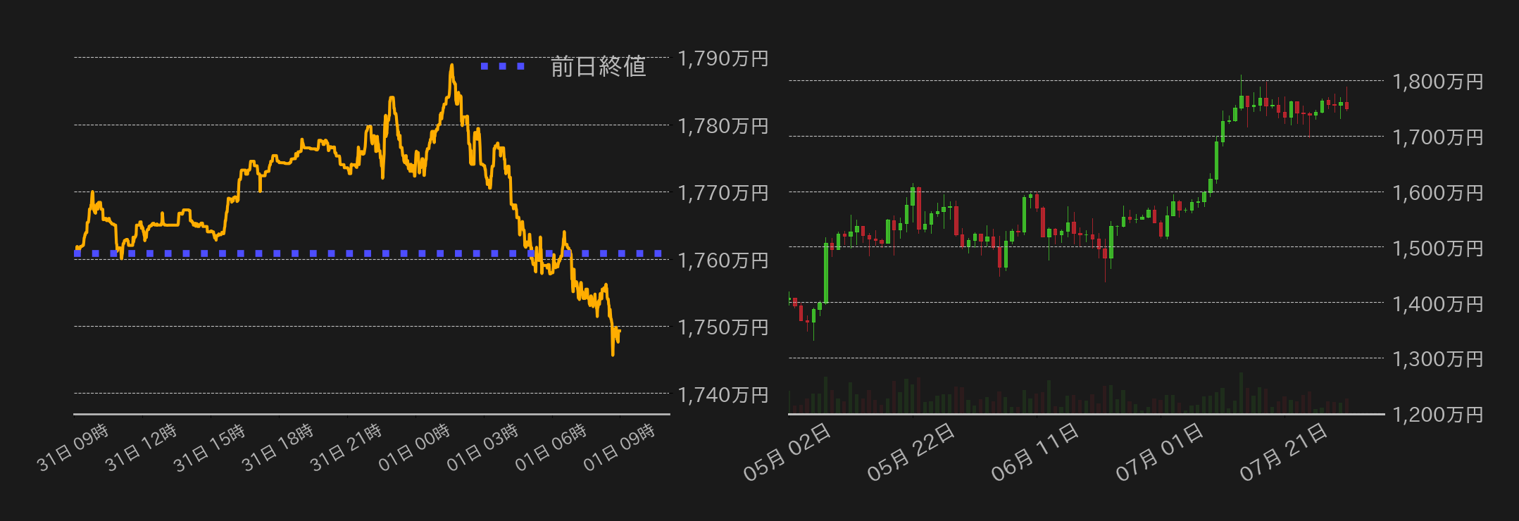 7月31日のビットコイン(BTC)円は1760万8052円から取引が始まった。東京時間は1760万円台で揉み合うも、米暗号資産(仮想通貨)政策レポートの内容を好感して欧州勢参入後からはジリ高に推移し1780万円を回復した。米国時間序盤には一時1790万円に肉薄するも、6月の米個人消費支出(PCE)デフレーターが上振れたほか、新規失業保険申請件数が市場予想ほど増加しなかったことで、市場ではFRBの利下げが9月から10月に延期されるとの見方が強まり、米国時間のBTC相場は下落一色となった。尤も、ドル円相場の上昇によってBTC円の下げ幅は限定され、終値は1749万2746円となった。
