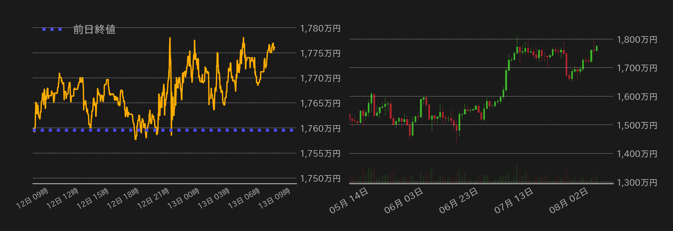 12日のビットコイン(BTC)円は1759万5001円から取引が始まった。7月の米消費者物価指数(CPI)を控え、東京時間は材料待ちとなり1765万円周辺で動意に欠ける展開に終始した。欧州時間も同様に小幅な揉み合いとなったが、前年比の米CPIが市場予想比で下振れたことで、市場は米連邦準備理事会(FRB)による9月の利下げの可能性をほぼ完全に織り込み、BTCは1775万円周辺まで反発した。尤も、ドル建てで節目の12万ドル周辺となる同水準で上値を抑えられ、残りの米国時間は上げ渋る展開となった。米国市場引け後もBTCは上値追いに失敗し、この日の高値圏で揉み合い、終値は1776万0001円となった。