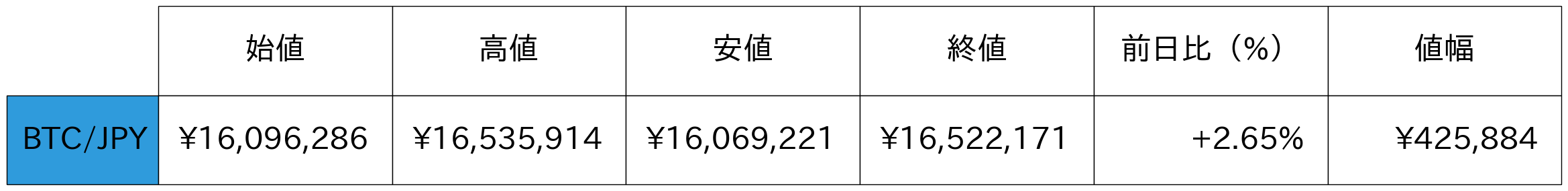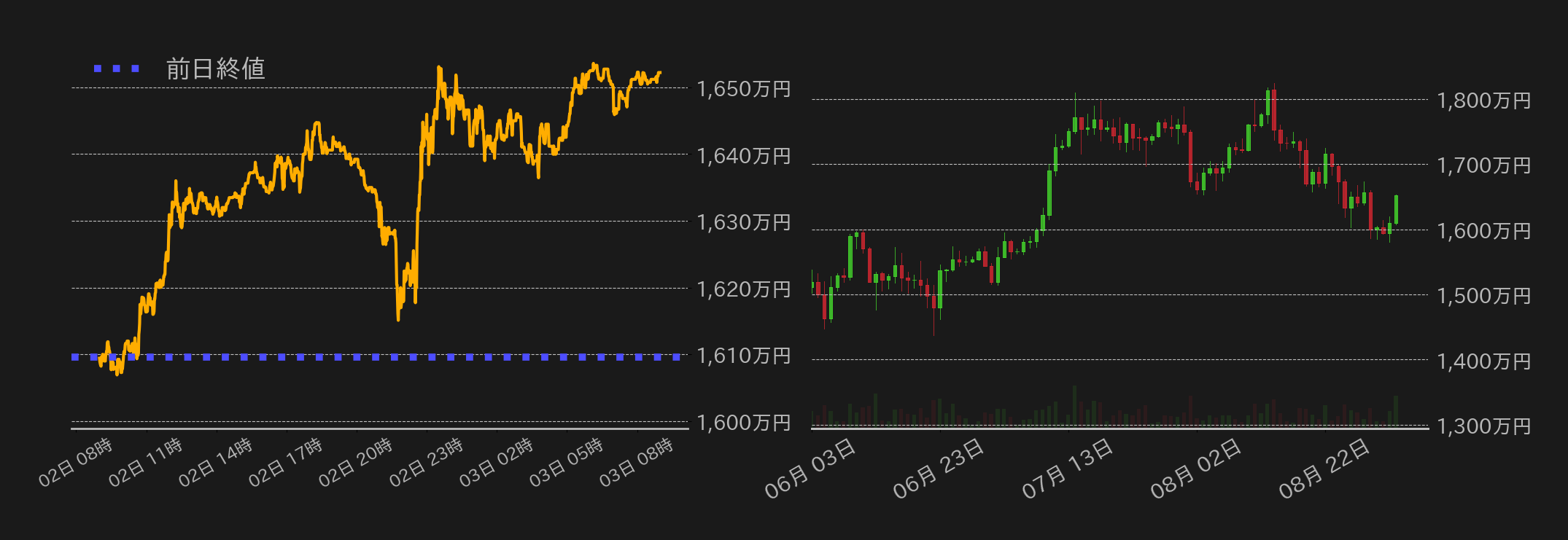 2日のビットコイン(BTC)円は1609万6286円から取引が始まった。東京時間は前日からの買い戻しの流れが続き、短期下降トレンドラインが走る1630万円を回復し、終盤にはドル円相場の上昇も相まって1630万円台後半まで戻した。米国時間に差し掛かると、米株先物の下落に連れて一時1620万円周辺まで反落するも、全米供給管理協会(ISM)が発表した製造業の景気指数(PMI)や雇用指数が景気拡大と縮小の閾値である50を割り込んだことで、FRBによる利下げ期待から相場は1650万円まで反発した。その後は上げ渋る展開となるも、主要経済国の長期債利回りが上昇するなか底堅い推移が続き、終値は1652万2171円と先週末の下げ幅をほぼ奪回した。