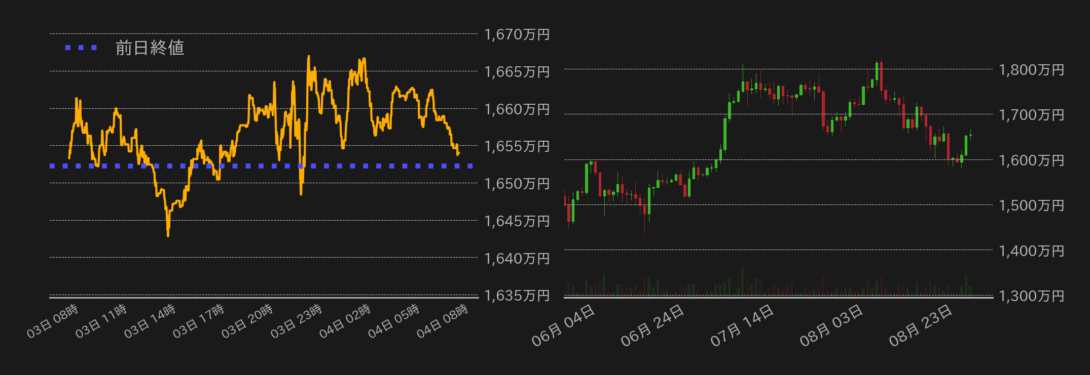 3日のビットコイン(BTC)円は1652万7364円から取引が始まった。前日の相場上昇の反動から東京時間のBTCは小甘く推移するも、海外勢参入後には米株先物の上昇を眺め下げ幅を奪回し、上値を窺う展開となった。米国時間に入ると、7月のJOLTs求人件数が市場予想比で下振れ(予:740万件、結:718万件)、ドル安・債券高が相場を1670万円近辺まで押し上げたが、外為市場でドル円相場が急落したことで円建てBTC価格の上値は限定された。米国市場引け後にはやや水準を落とし、終値は1653万9956円とほぼ変わらず。ただ、ドル建てでは11万1000ドル台後半に戻した。