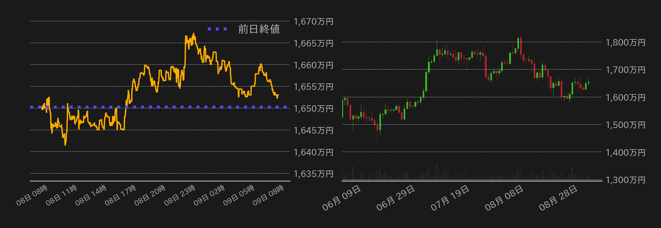 8日のビットコイン(BTC)円は1649万6860円から取引が始まった。東京時間は週末の反発から一転し、1645万円絡みで揉み合いに終始したが、欧州時間に差し掛かるとドルや米金利の下落を眺めて1660万円まで戻した。米国時間序盤には、金利が一層低下するなか、米国株相場の上昇に連れて1667万円まで上昇。しかし、序盤の上昇後にナスダックが上げ渋ると、BTCは1660万円周辺まで水準を落とした。米国時間終盤からは材料難で1650万円から1660万円の間で揉み合いに転じ、終値は1653万円。ドル建てでは11万2000ドル(≒1649万円)を回復し、先週の米雇用統計後の下げ幅を縮小した。