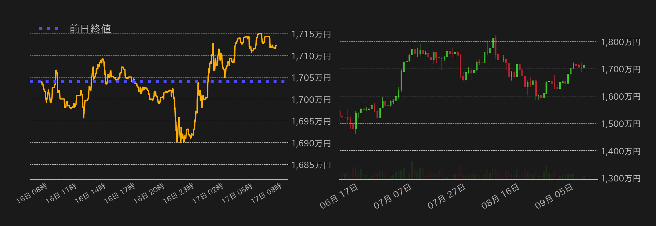 16日のビットコイン(BTC)円は1703万9188円から取引が始まった。先週末から相場はドル建てで8月14日高値と9月1日安値の半値戻しとなる11万5891ドル(≒1705万円)周辺で小幅な揉み合いに終始し、円建てではこの日の東京時間も1705万円絡みで動意に欠ける展開が続いた。米国時間序盤に発表された8月の米小売売上高が市場予想を上回ると、一時は1690万円まで下落したが、本日の米連邦公開市場委員会(FOMC)最終日を控え、利下げ観測からドル安・債券高(金利は低下)が加速するとBTCは反発し、米国市場中盤には1710万円を回復した。終値にかけては11万7000ドル水準となる1714万円にタッチし、1712万2951円でこの日の取引を終えた。
