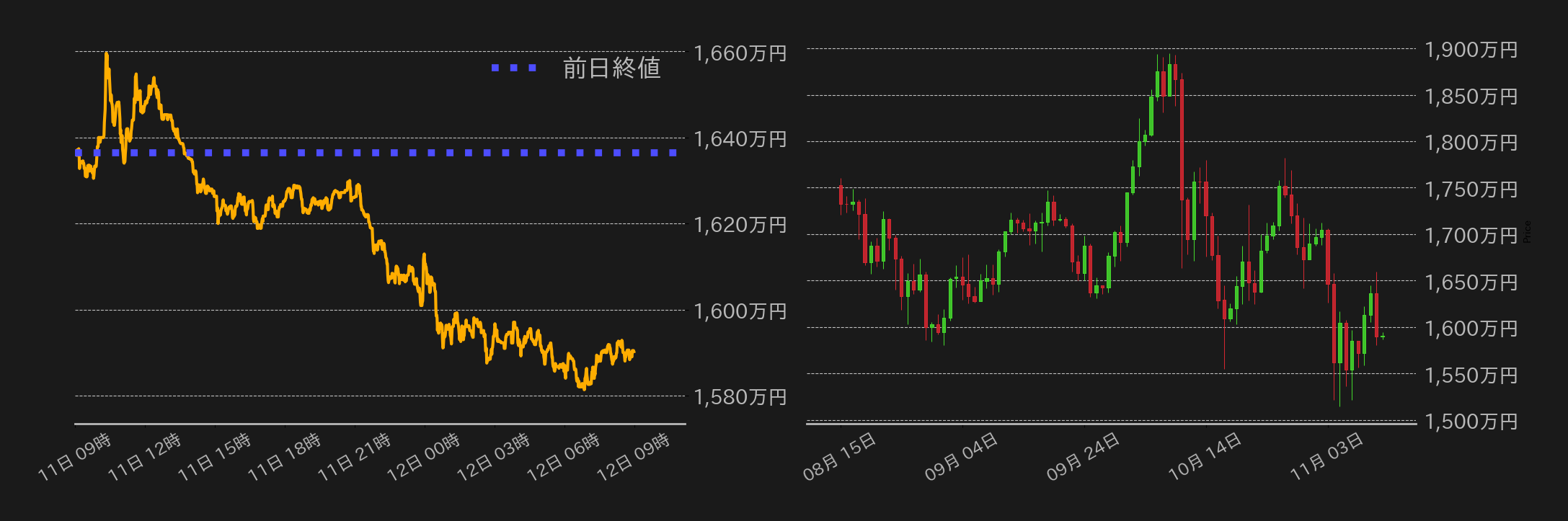 BTC反落で1600万円割れ 短期筋の損切りが重石に