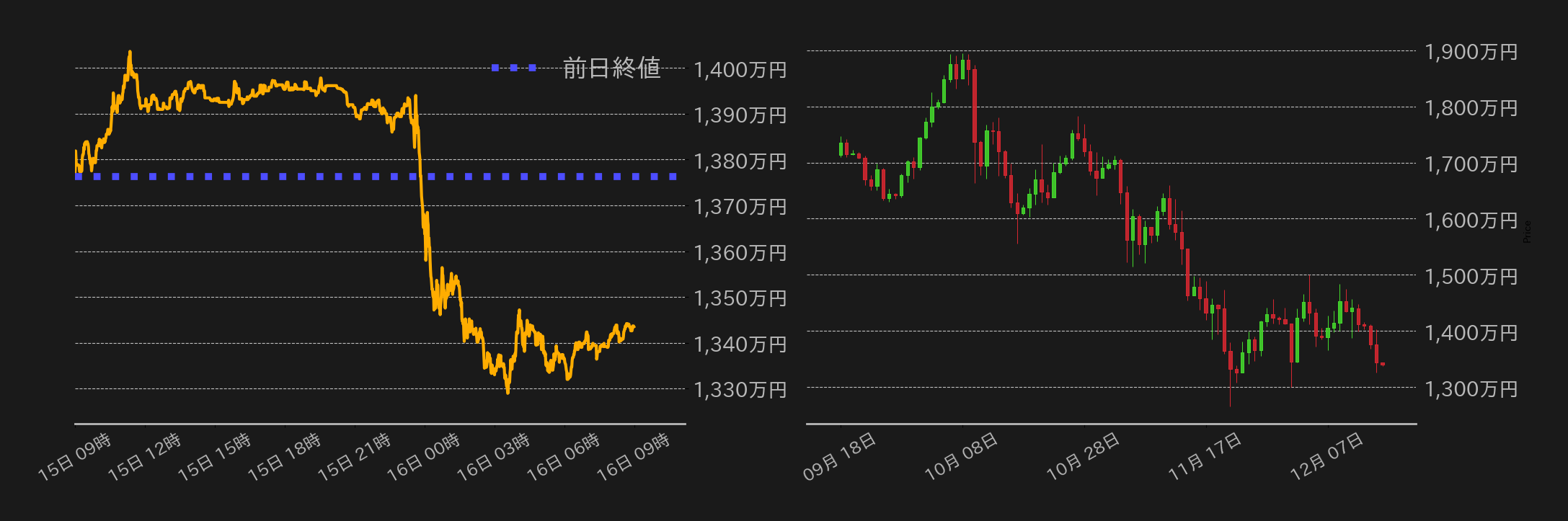 15日のビットコイン(BTC)円は1376万3657円から取引が始まった。東京時間はシカゴマーカンタイル取引所(CME)のBTC先物が上窓を埋める動きとなり、一時1400万円を回復した。一方、窓埋め達成後は上げ渋る展開となり、欧州時間は1390万円で小動きに転じた。ただ、米国時間には、AIバブル懸念から米ハイテク株が下落。加えて、次期FRB総裁を巡って、トランプ米大統領の側近がハセット米国家経済会議委員長の指名に反対していると報じられたこともBTC相場の重石となり、相場はロングの投げを伴って1326万円まで急落を演じた。その後は下げ止まるも、戻りは鈍く、終値は1343万5097円となった。