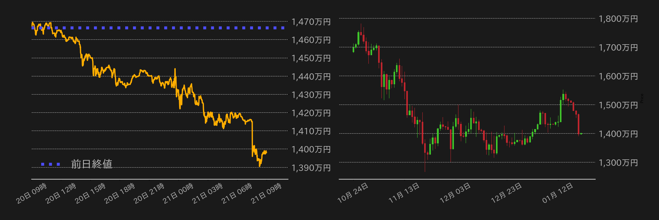20日のビットコイン(BTC)円は1466万4173円から取引が始まった。東京時間は弱含みに推移し、前日の安値1453万8161円を割り込むと、売りが加速し1430万円周辺まで水準を下げた。欧州勢参入後は下げ止まる場面もあったが、トランプ米大統領がフランスに対してワインなどの商品に200%の関税を課すと発言したことにより、リスクオフムードが浮上するなか、米株・米国債・ドルの急落と連動し、米国時間のBTCは下値を模索する展開となり、終盤には1410万円近辺まで下落した。米国市場引け後にはロングの投げを伴って一段と売り込まれ、終値は1400万円を割り込んで1397万9996円と、年初からの上げ幅の殆どを吐き出した。