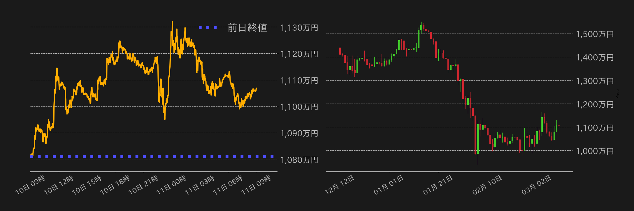 10日のビットコイン(BTC)円は1081万0300円から取引が始まった。朝方、トランプ米大統領がイラン紛争は「間もなく終結する」と発言したほか、G7による石油備蓄の協調放出の可能性、さらに米国がロシア産原油への制裁緩和を検討しているとの報道を受け、原油価格の下落がBTC相場の支援となり、東京時間には1100万円を回復した。欧州勢参入後には1120万円周辺で失速し、一時は戻り売りに押される場面もあったが、米国株の上昇に連れ高となり、米国時間序盤には高値1132万3438円に浮上した。しかし、イランがホルムズ海峡で機雷敷設の準備をしているとの報道を受け、その後は上げ幅を縮小。ただ、米軍が機雷敷設船に大規模な攻撃を実施し、これらを破壊したとの報道もあり、売りは限定された。終値は1106万8427円となり、先週後半の下げ幅を取り戻しつつある。