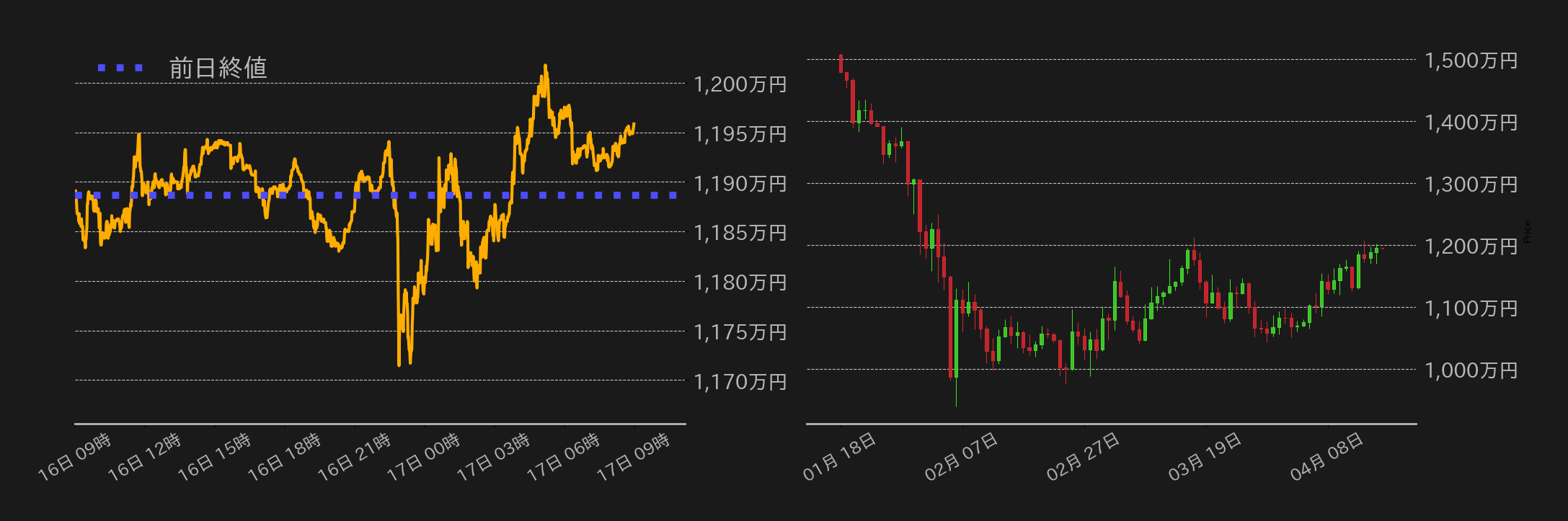 16日のビットコイン(BTC)円は1188万6879円から取引が始まった。中東情勢を巡り、市場が米国とイランの和平交渉再開待ちとなるなか、東京時間は1190万円を挟み込み小動きに終始した。欧州時間には、直近で下げが続いていたドルが反動高となり、BTCはやや軟化すると、米国時間序盤には1170万円近辺まで下落した。尤も、イスラエルとレバノンが10日間の停戦で合意したほか、トランプ米大統領がイランとの協議が今週中にも再開される可能性があると発言し、中東の緊張緩和期待から残りの米国時間は反転上昇し、1190万円台に戻した。今朝方には高値1201万7851円に浮上するも、その後は戻り売りに押され、終値は1195万8500円となった。
