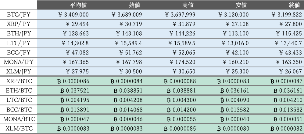 チャート上では、相場は三角持ち合いを下方にブレイクし、下降トレンド開始が示唆されている。三角持ち合いでは、ベース(三角形が形成され始めた時点の辺)の長さがブレイク後のプライスターゲットとされ、厳密にパターンフォーメーションから考えると、今回の場合は350万円周辺から135万円ほど下げた215万円(≒20,700ドル)がターゲットとなる(第2図)。実現すれば、今月高値から約50%と大幅な下落となるが、仮想通貨市場ではこれほどのスピード調整も視野に入れておくべきか。