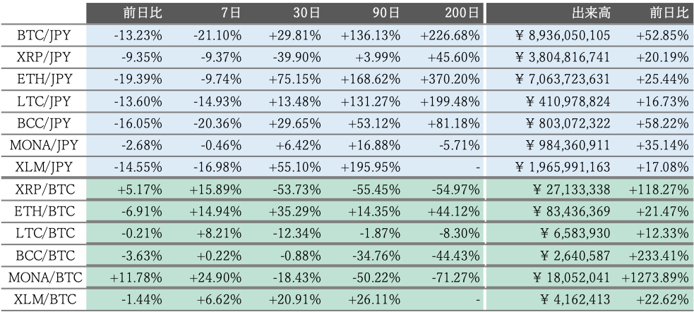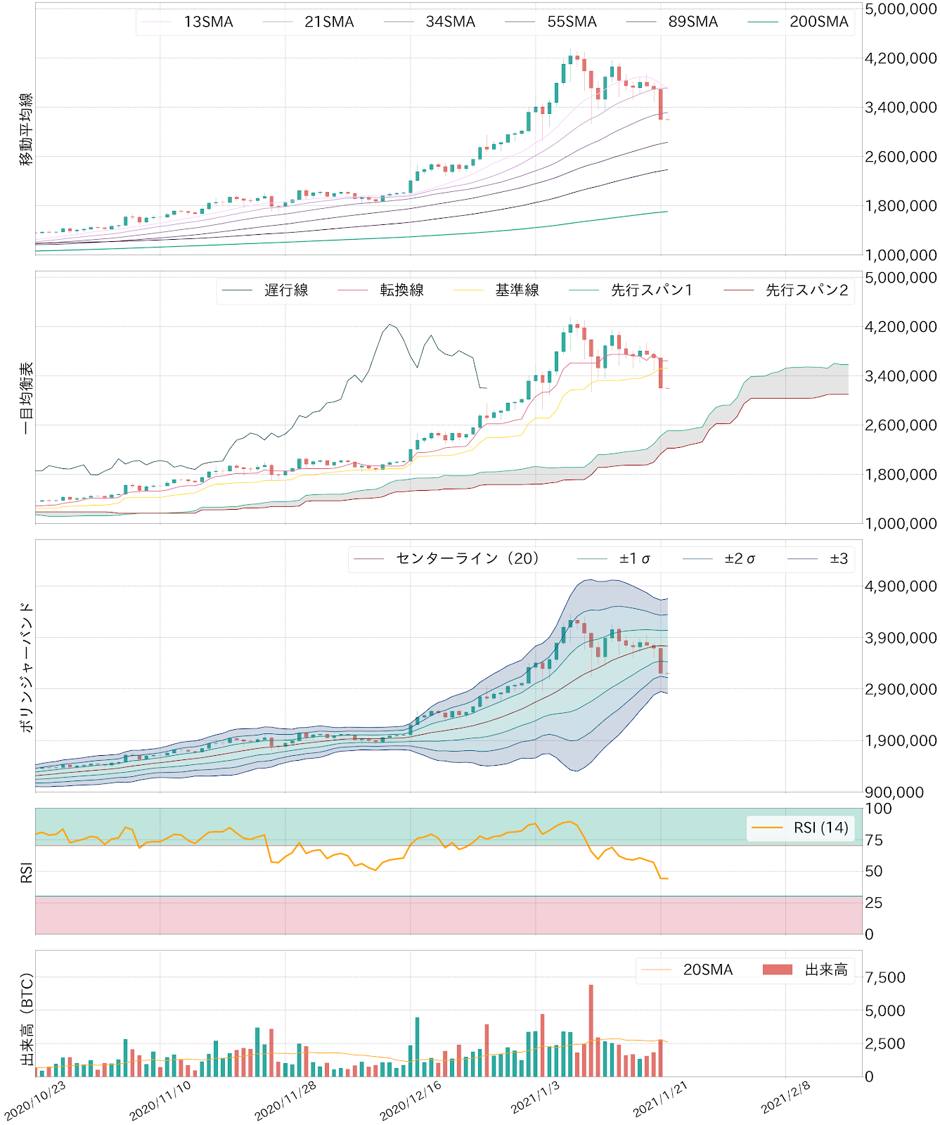 21日のビットコイン(BTC)対円相場は487,754円(13,23%)安の3,199,822円と大幅安。今月8日に435万円に乗せて以来、2週間弱で123万円ほど吐き出した。昨日はアルトコインも概ね急落し、暗号資産(仮想通貨)市場は全面安の様相を呈した。