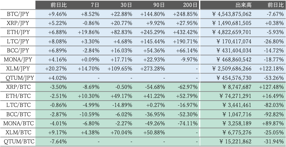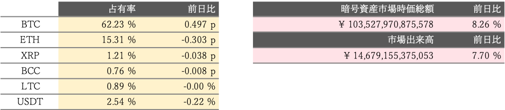 第3表:市場時価総額・出来高(¥)、主要銘柄市場占有 当日9時時点のデータ ※前営業日比 出所:CoinGecko.comより作成