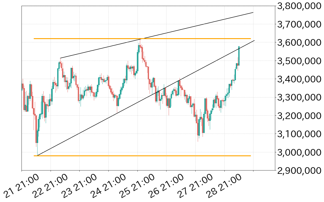 BTC相場は、前回指摘した短期上昇ウェッジ(第2図内黒線)の下辺を回復し、安値圏から粘り腰を発揮しているが、依然としてレンジ内(第2図オレンジ線)での推移が続いている。レンジ上辺(362万円)を上抜けすればリバーサルサインのダブルボトム完成となるが、終値で明確にこの水準を上回るまで一喜一憂は禁物だろう。