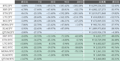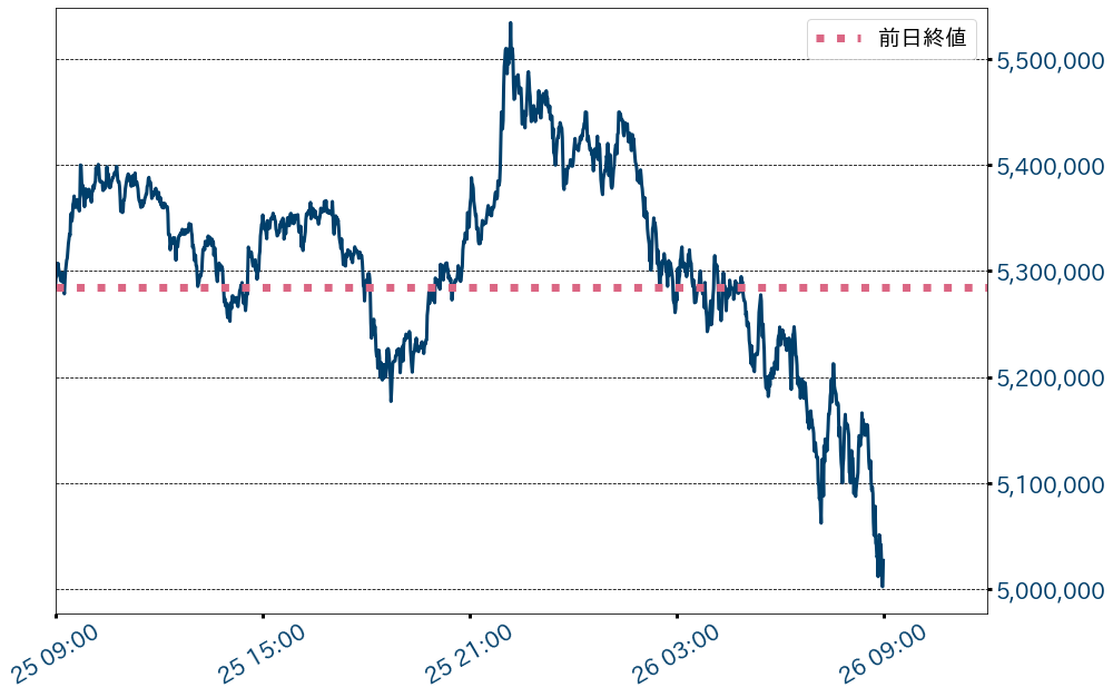 25日のビットコイン(BTC)対円相場は257,753円(4.88%)安の5,026,895円と反落。昨日は一部のアルトコインが上昇して終値を付けるも、市場では概ね上値の重さが目立った。
