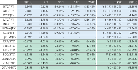 2日のビットコイン(BTC)対円相場は125,617円(2.36%)安の5,191,998円と反落するも、節目の500万円は維持した。