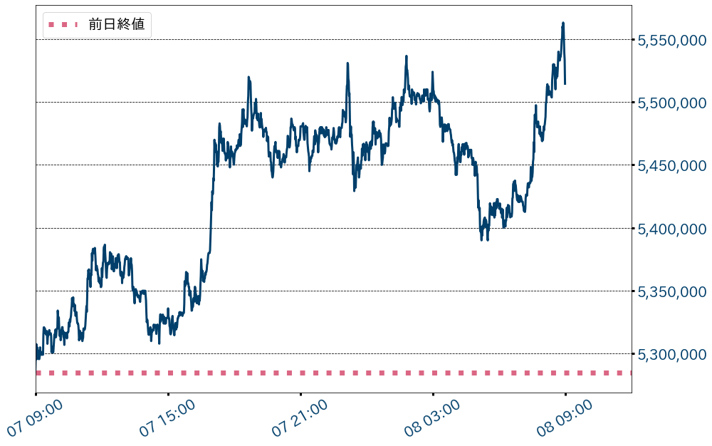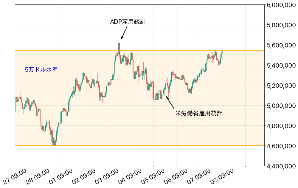 先週(1日〜7日)のビットコイン(BTC)対円相場の週足終値は、前週比693,247円(14.38%)高の5,514,488円と反発し、節目の500万円を回復。対ドルでも心理的節目の50,000ドルを二週間ぶり奪回した。