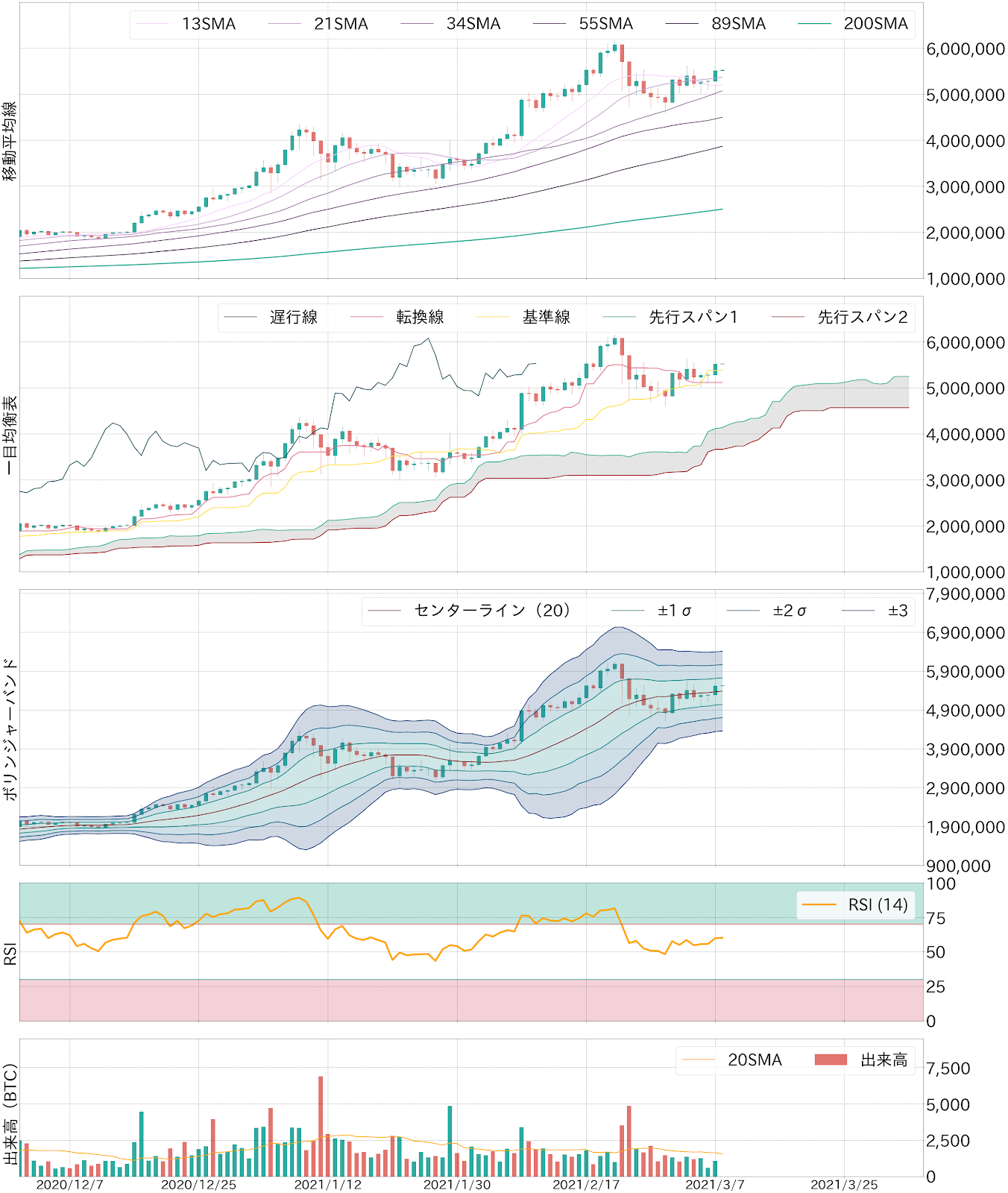 先週のBTC相場は、週末2月27日の米追加経済対策案の下院通過により、週明けから米経済回復期待に伴うリスクオンムードの恩恵を受け、480万円から一段高で530万円に戻した。週央までこの流れが続き、3日にはレンジ上限を試す展開となるも、この日のADP雇用統計が前月比で伸びが鈍化する結果となると、経済回復期待や雇用拡大によるインフレ進行観測が後退し急反落。さらに、翌4日にパウエル米連邦準備理事会(FRB)議長が長期金利上昇に対して静観スタンスを示したことも相場の重石となり、BTC相場は一時510万円まで値を下げた。