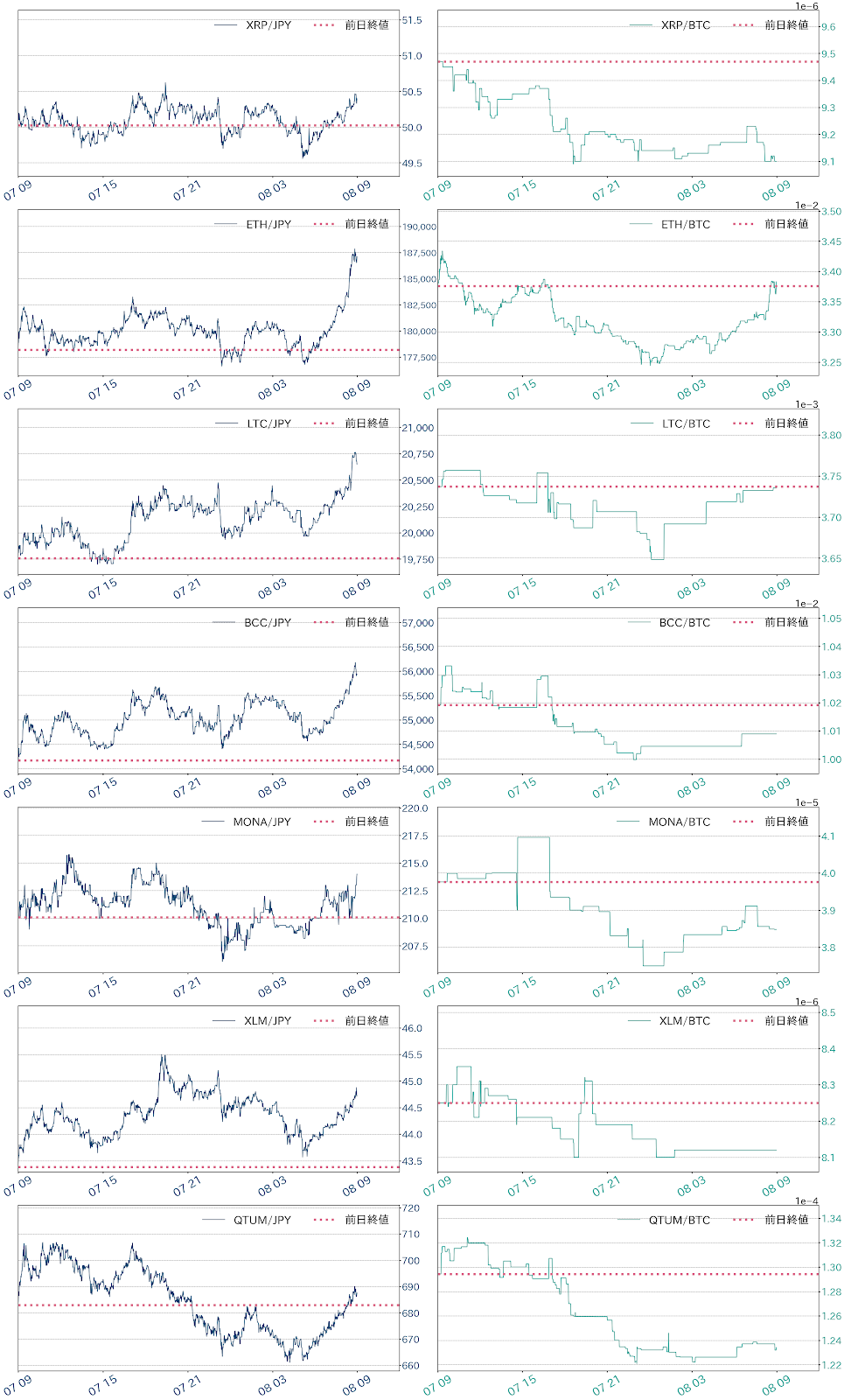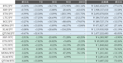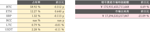 チャート上では、BTC対円相場は先週末にかけてとさほど変わらず、短期的に方向感に欠ける展開が続いている。相場は、中期の34日移動平均線に支えられ、ボリンジャーバンドのセンターライン回復も果たした一方で、一目均衡表では均衡表が逆転(転換線が基準線でデッドクロス)しており、早期の売りシグナルが一つ点灯している状態。ただ、相場が3日の高値(562.7万円)を更新し、5日安値(501万円)を守れば、向こう2日間で三役好転を再び示現する見通しで、値固め局面からの脱出も視野に入る。