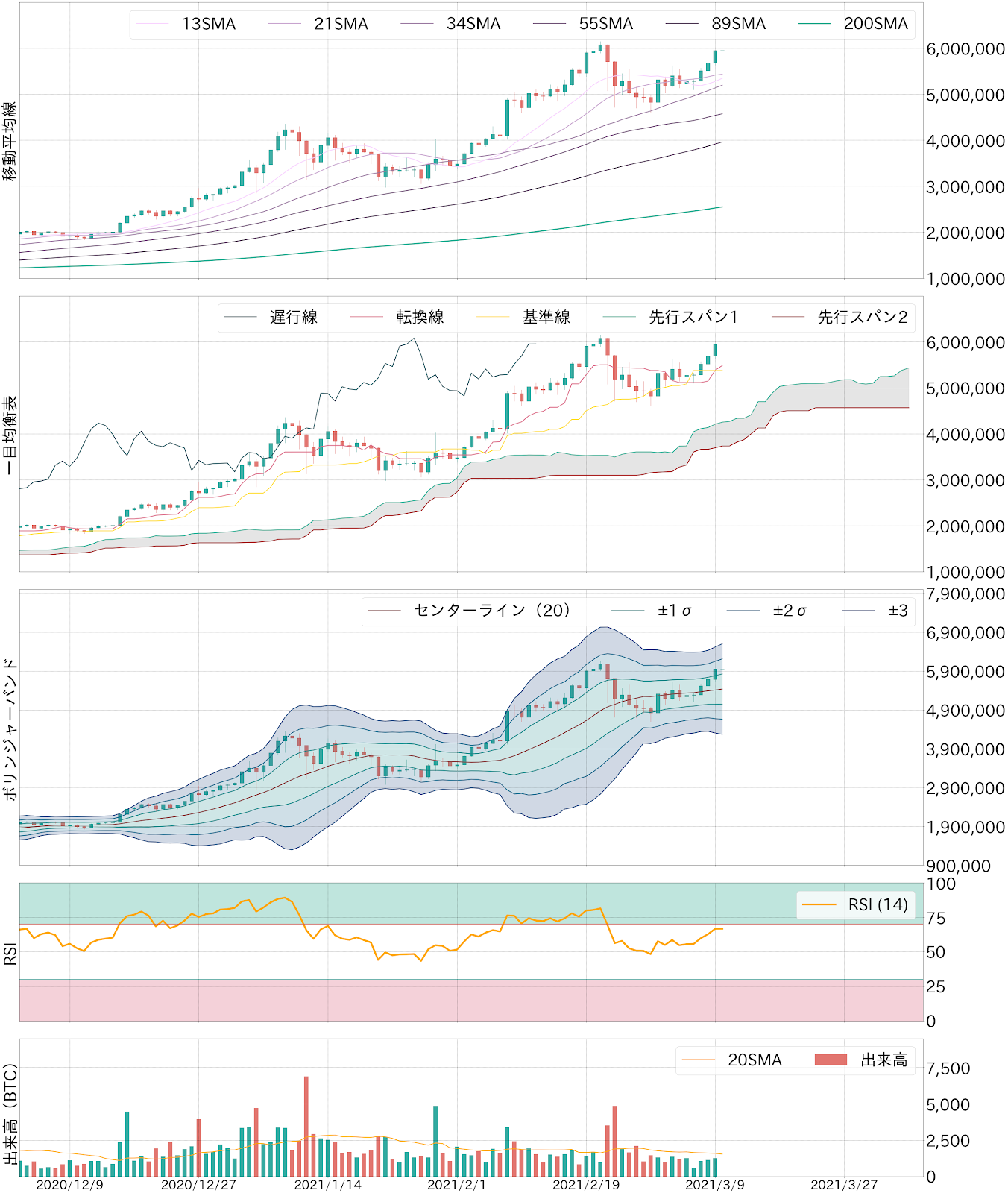9日のビットコイン(BTC)対円相場は263,105円(4.63%)高の5,951,105円と5日続伸。相場は短期レンジの上方ブレイクに成功し、およそ2週間ぶりに終値で590万円を奪回した。