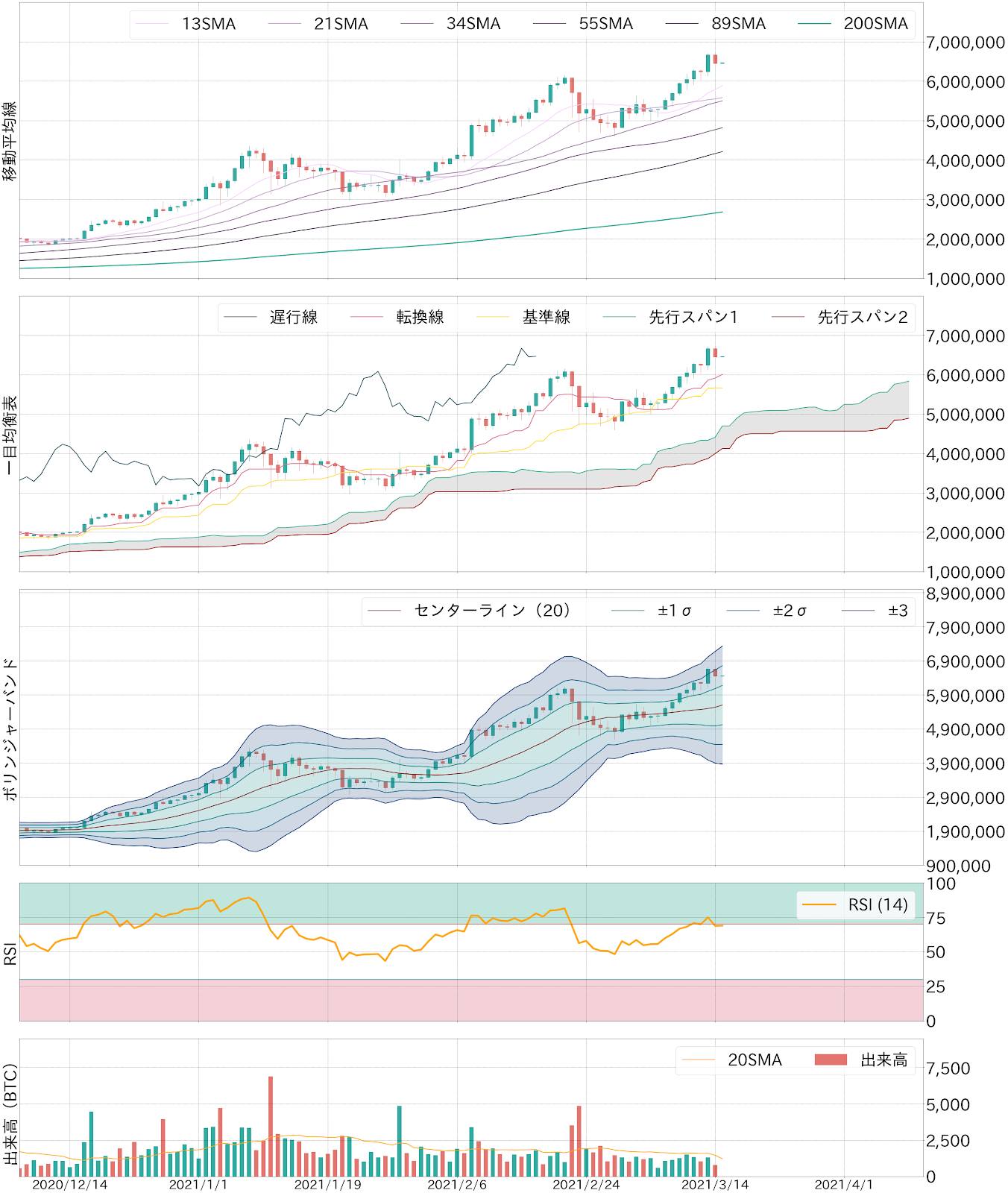 テクニカル的には、BTC相場は「完全復帰」と言える。移動平均線では強気のパーフェクト・オーダー(期間の長い線が下から順に並ぶ現象)が出現、一目均衡表では三役好転を示現、ボリンジャーバンドではスクイーズ(バンド幅縮小)からボージ(バンド幅拡大)出現に相場の2σ上抜けが伴っており、とにかく強気一色だ。低調な出来高が気掛かりではあるが、米国での個人現金給付の進行や、FOMCの結果次第では60,000ドル台の定着も視野に入る。