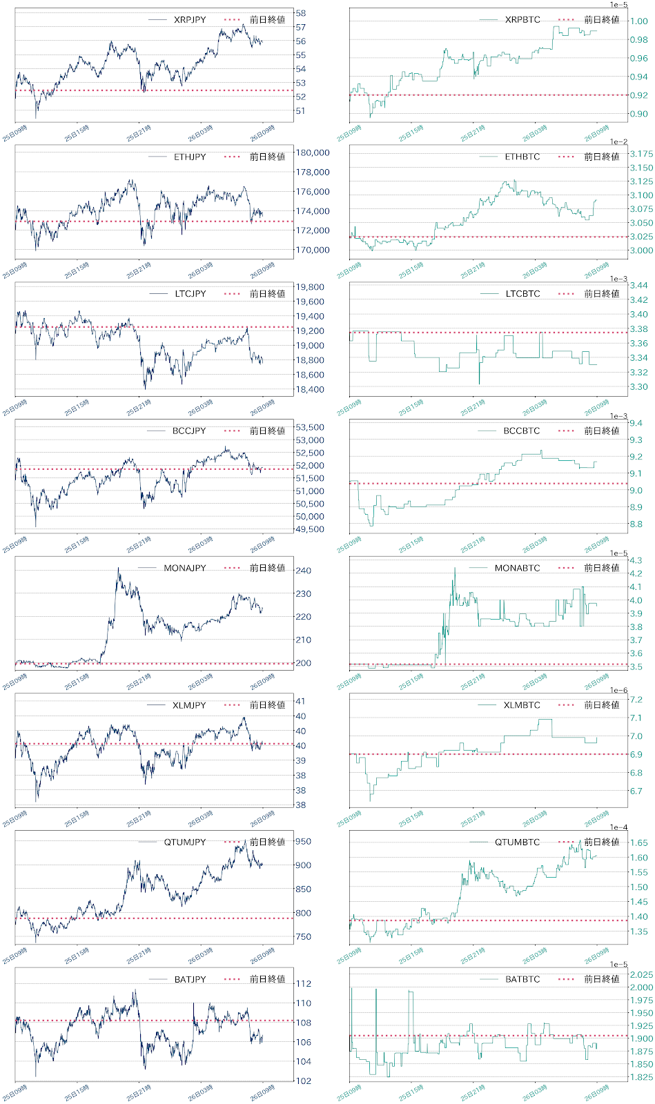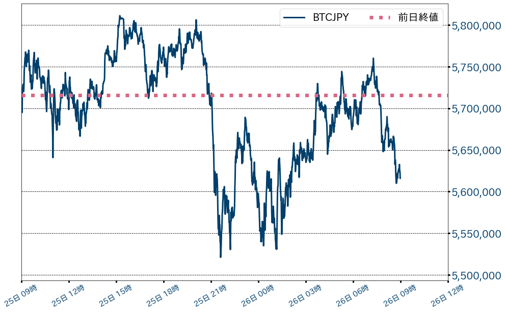 25日のビットコイン(BTC)対円相場は99,806円(1.75%)安の5,616,000円と二日続落。