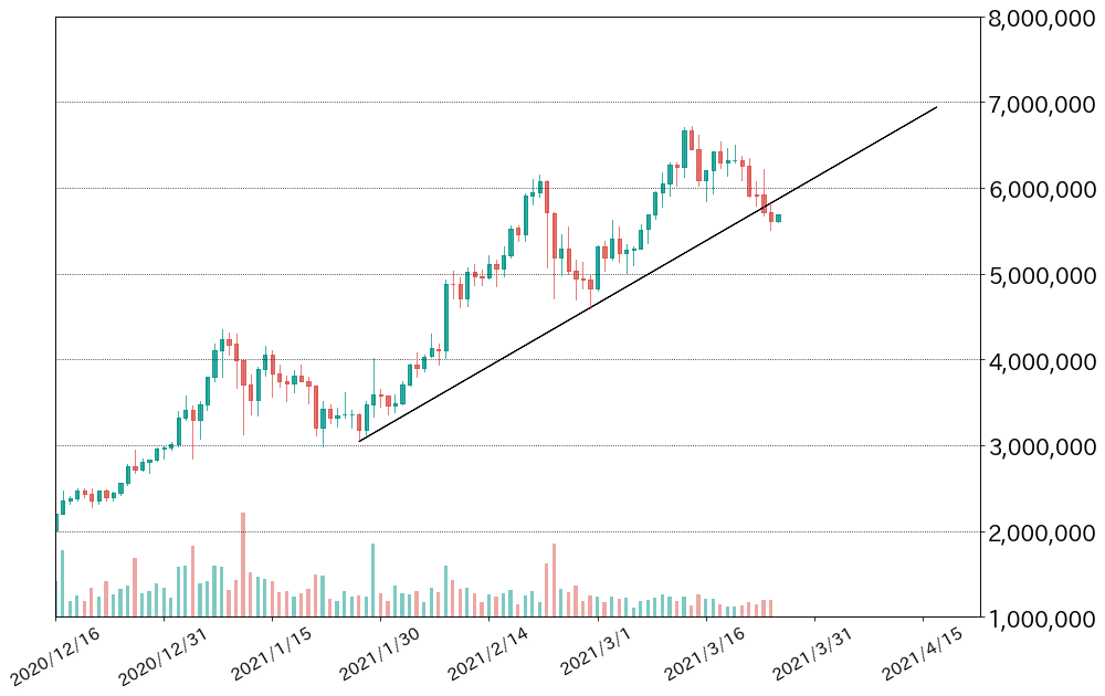bitbank Report 2021/03/26:トレンドラインを割ったビットコイン 上昇トレンドはもう終わりか?
