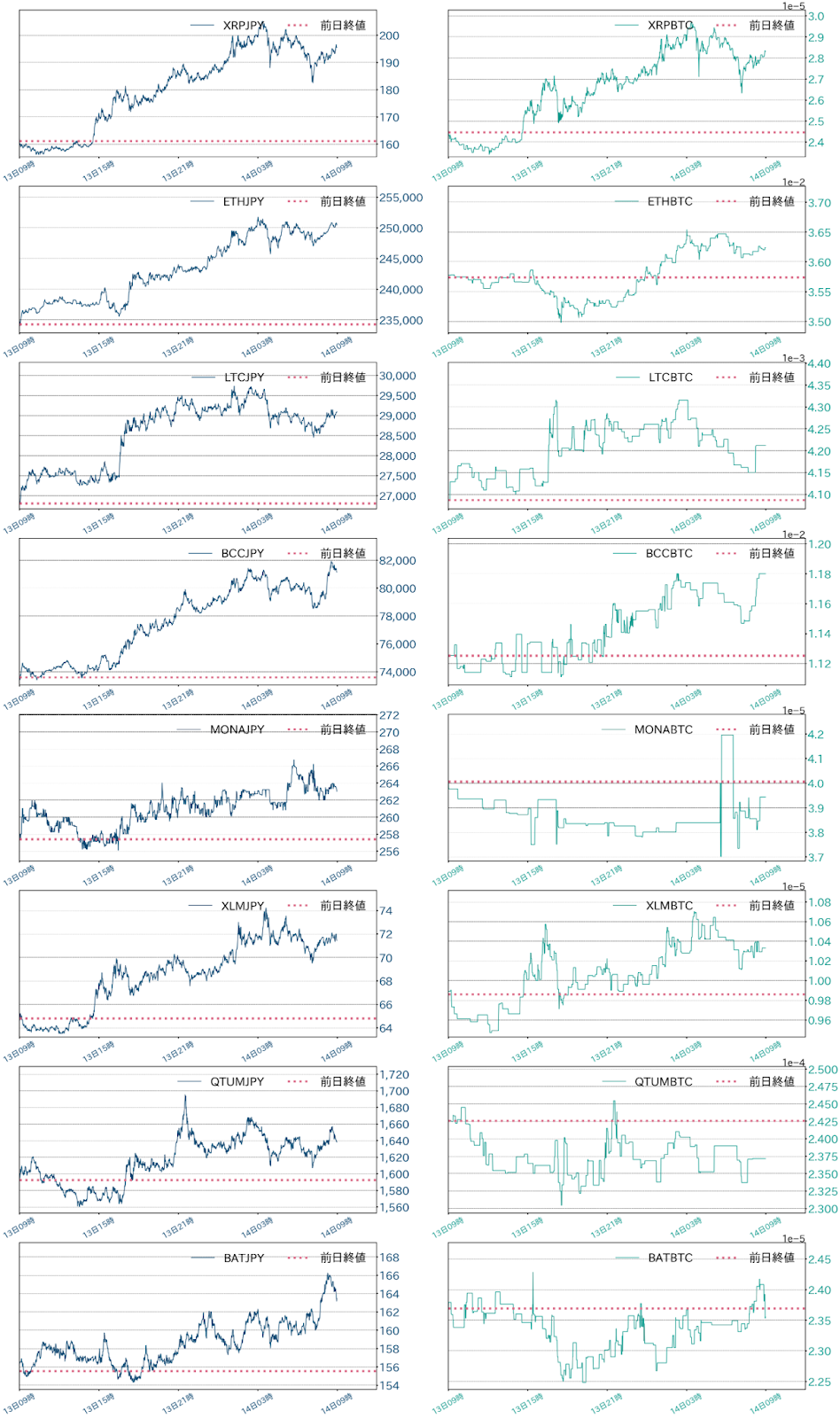 13日のビットコイン(BTC)対円相場は354,828円(5.40%)高の6,923,350円と上伸し、過去最高値(6,724,683円)を更新した。対ドルでも最高値の61,788ドルを更新し、63,774ドルの高値を付けた。イーサリアム(ETH)の対円も最高値を更新し、16,331円(6.97%)高の250,582円。リップル(XRP)対円は終値にかけて売られるも、一時は205円にタッチし、2018年1月15日以来の高値に浮上した。