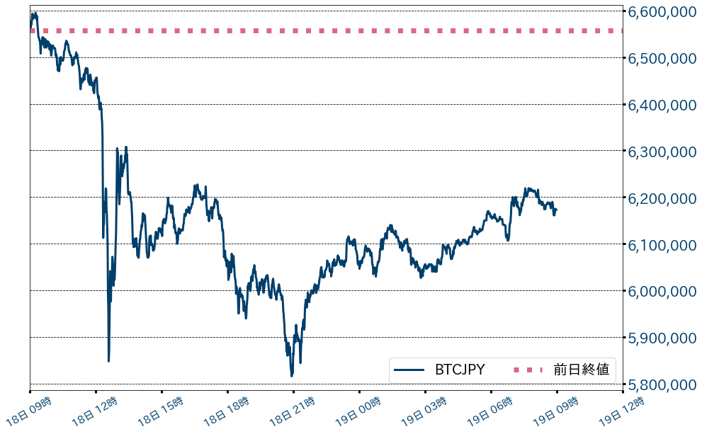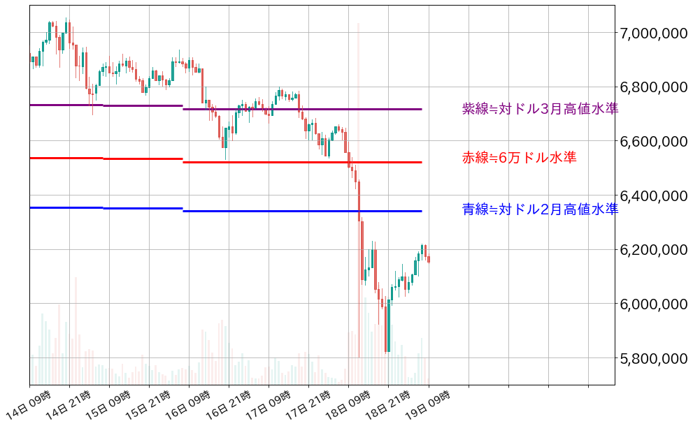 足元のビットコインは、580万円から安値拾いの買いに支えられ、620万円周辺まで戻している。