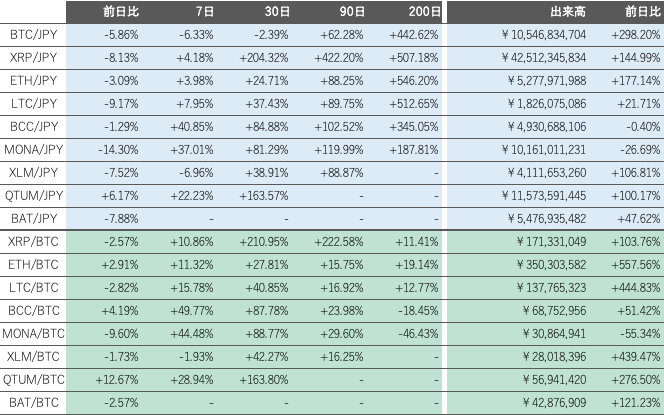 先週(12日〜18日)のビットコイン(BTC)対円相場の週足終値は、激しい値動きの中、前週比416,998円(6.33%)安の6,173,000円と3週ぶりに反落し、2週間ぶりの安値まで押した。
