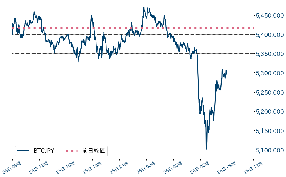 先週のビットコイン(BTC)対円相場の週足終値は、前週比866,352円(14.03%)安の5,306,648円と大幅安となり、およそ7週ぶりの安値まで下落した。XRP、ライトコイン、ビットコインキャッシュといった主要アルトコイン相場も強く押し、週足ではそれぞれ27.65%、19.19%、23.36%と下落。一方、アプリケーションのプラットフォームとなるイーサリアム(ETH)の対円は、5,309円(2.16%)と週次で上昇した。
