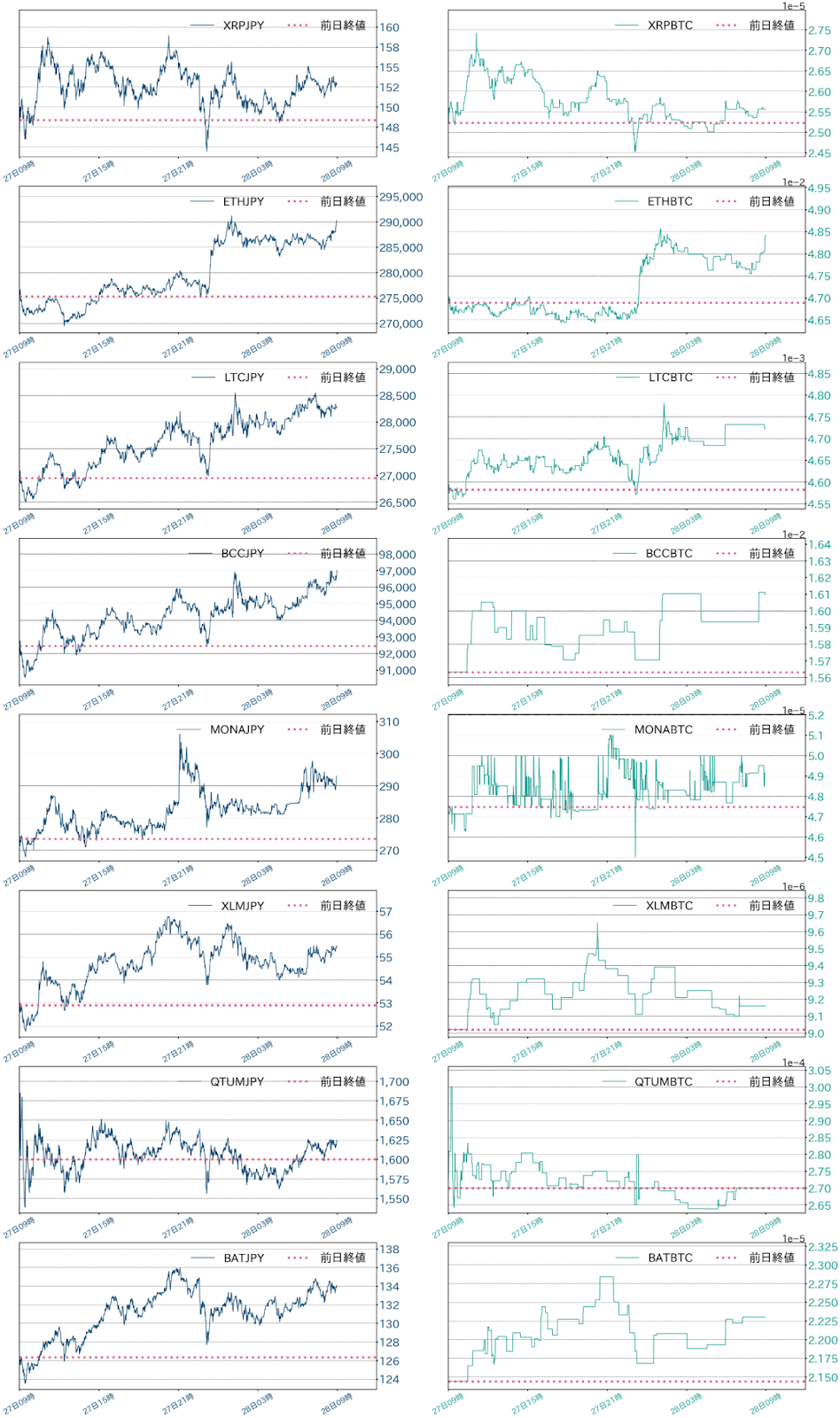 一方、イーサリアム(ETH)の対円相場は、欧州投資銀行(EIB)がイーサリアム上で1.2億ドル相当のデジタル債権を発行するとの報道を受け、終値で史上最高値を更新し、291,200円の高値を記録した。